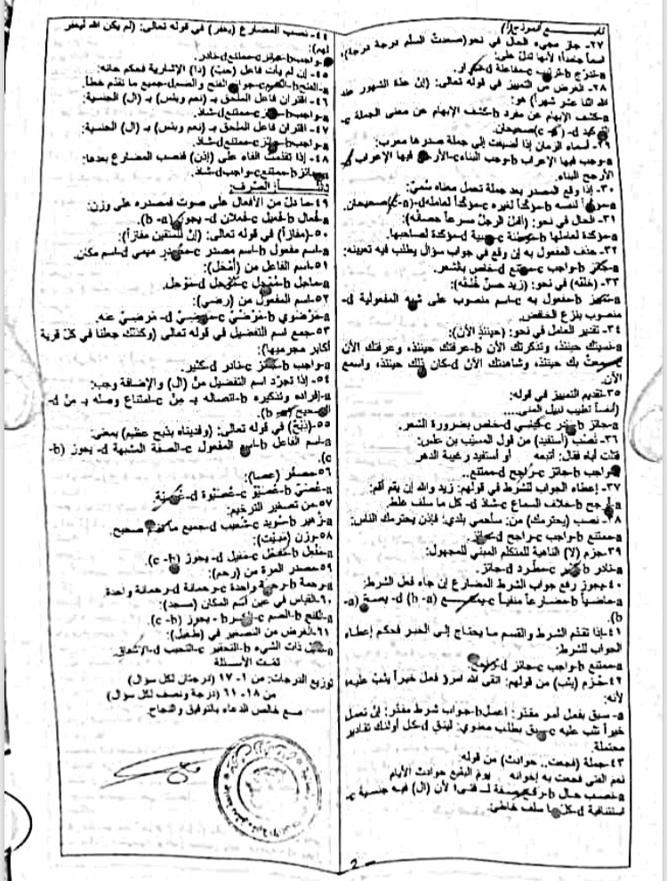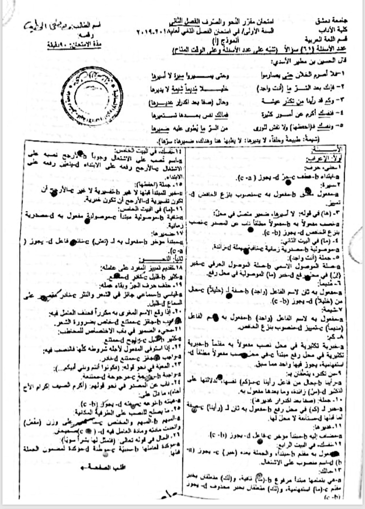 اسئلة اختبار في مادة النحو والصرف للسنة1 فصل2 عام2019 (نموذج أ) جامعة دمشق كلية الاداب قسم لغة عربية