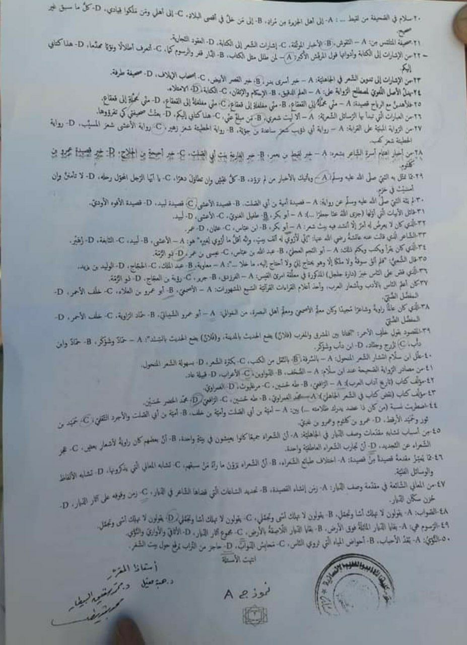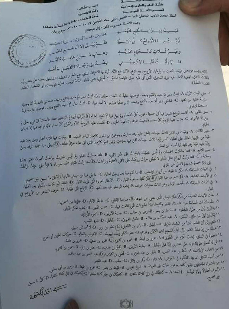 اسئلة اختبار في مادة الادب الجاهلي للسنة1 فصل2 عام2020 جامعة دمشق كلية الاداب قسم لغة عربية