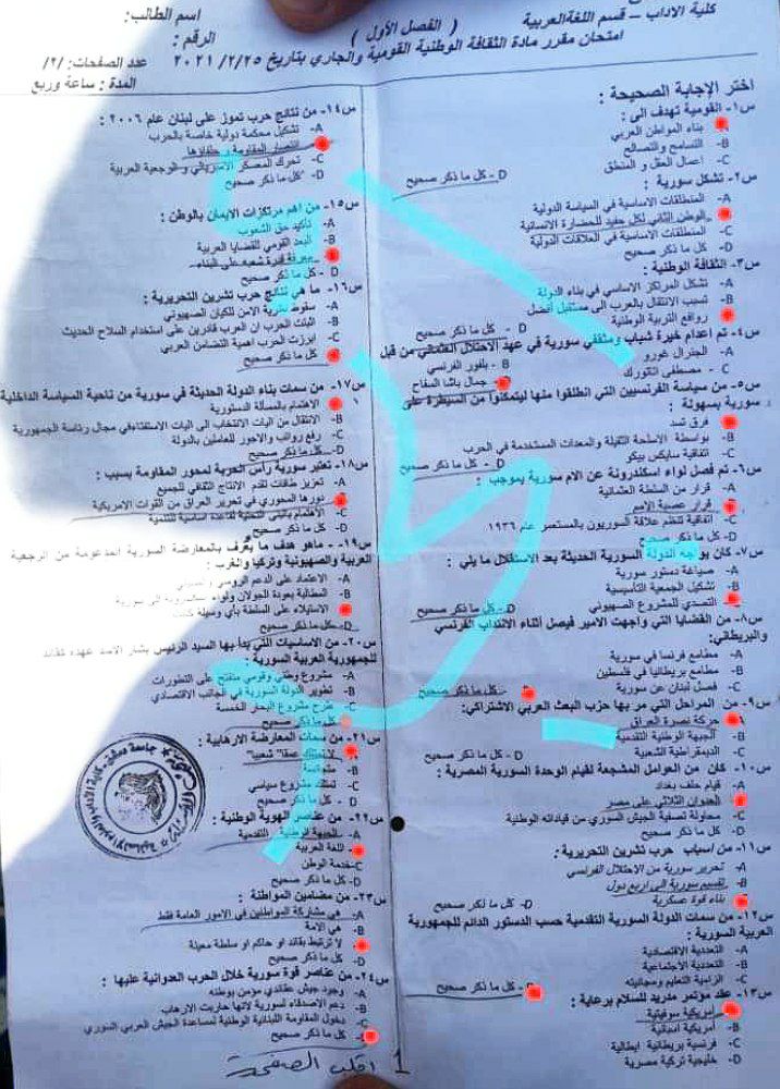 اسئلة اختبار في مادة الثقافة للسنة1 فصل1 عام2021 جامعة دمشق كلية الاداب قسم لغة عربية