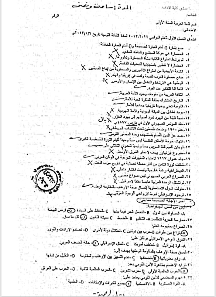 اسئلة اختبار في مادة الثقافة للسنة1 فصل1 عام2013 جامعة دمشق كلية الاداب قسم لغة عربية