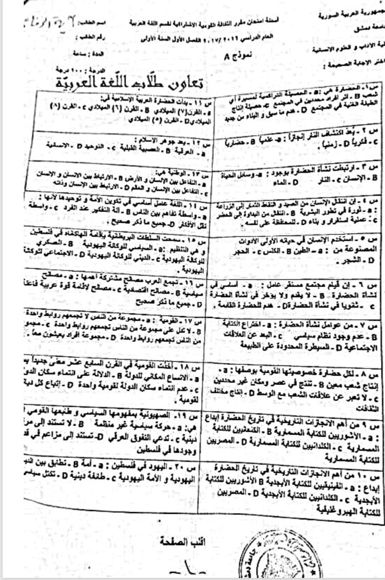 اسئلة اختبار في مادة الثقافة للسنة1 فصل1 عام2017 جامعة دمشق كلية الاداب قسم لغة عربية