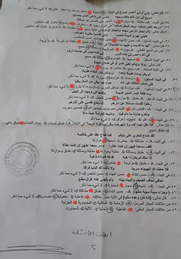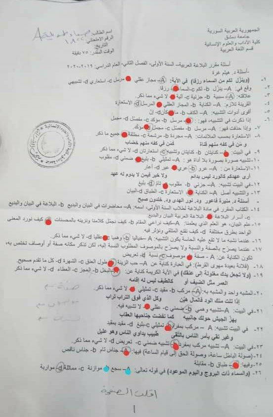 اسئلة اختبار في مادة البلاغة العربية للسنة1 فصل2 عام 2020 جامعة دمشق كلية الاداب قسم لغة عربية