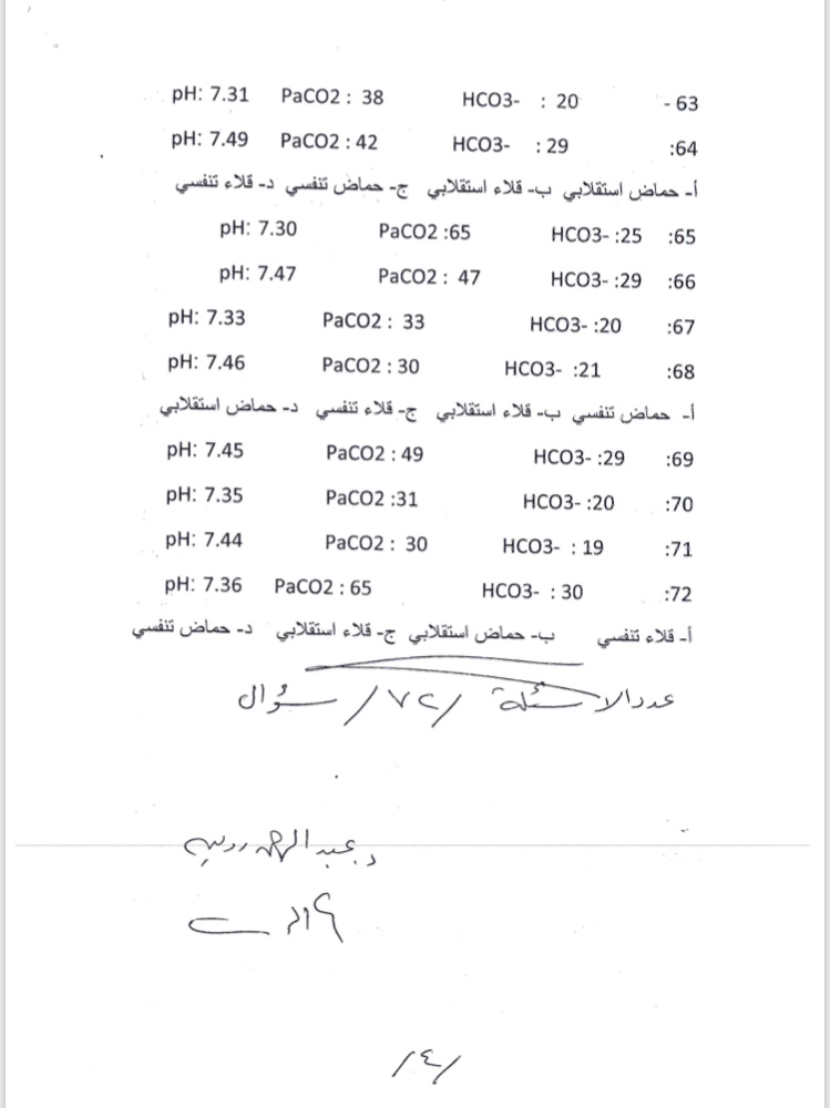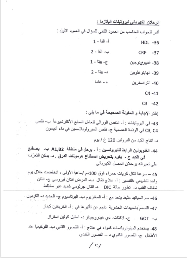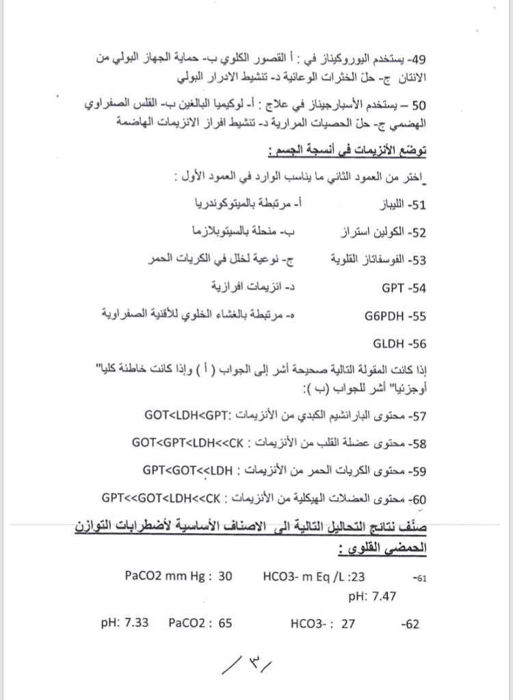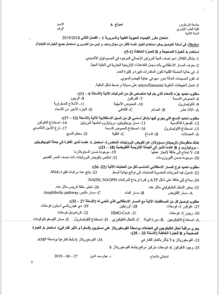 اسئلة اختبار في مادة الكيمياء الحيوية والسريرية1 للسنة2 فصل2 عام2018-2019 جامعة طرطوس كلية الطب البشري