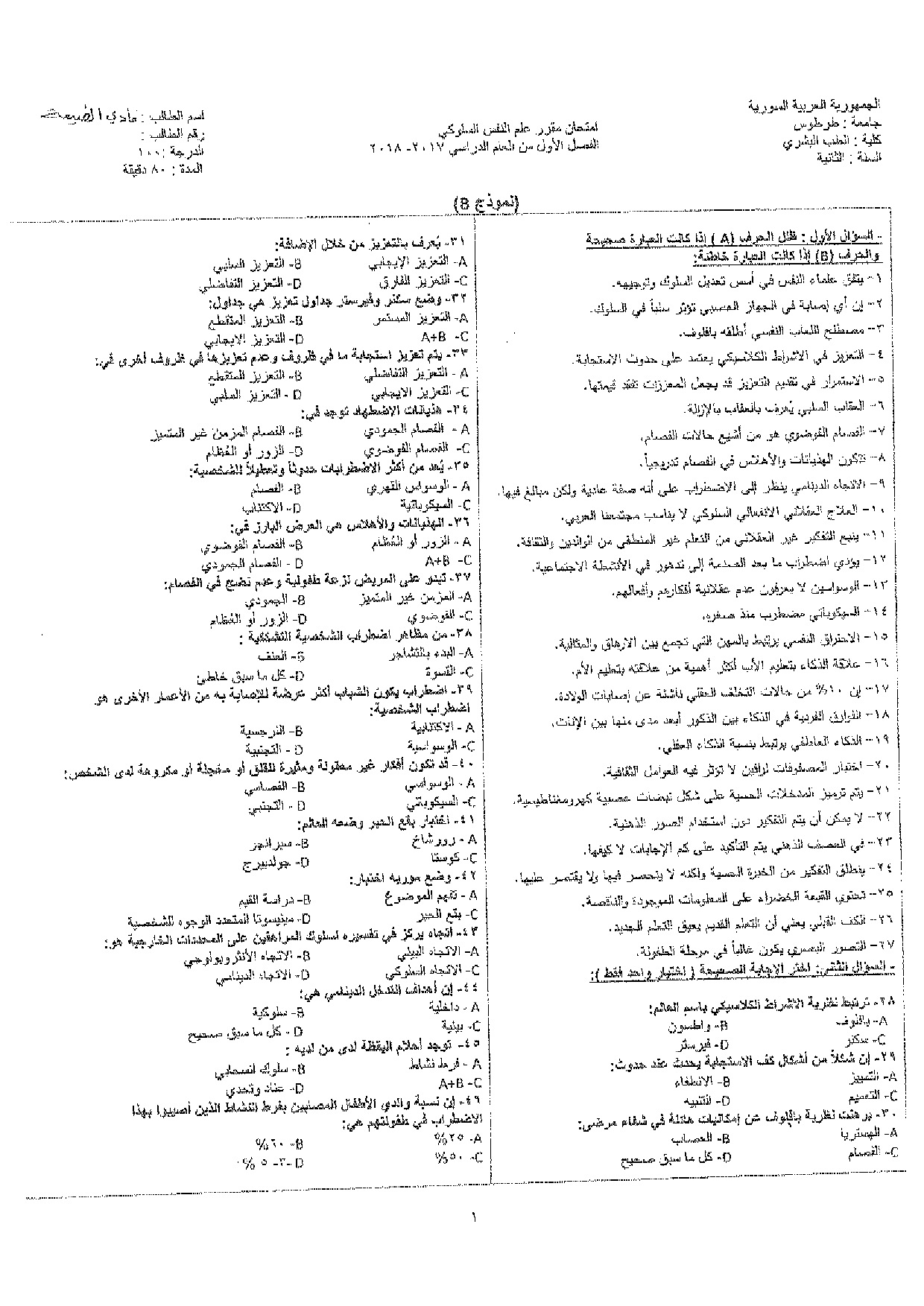 اسئلة اختبار في مادة علم النفس السلوكي للسنة2 فصل1 عام2018 جامعة طرطوس كلية الطب البشري