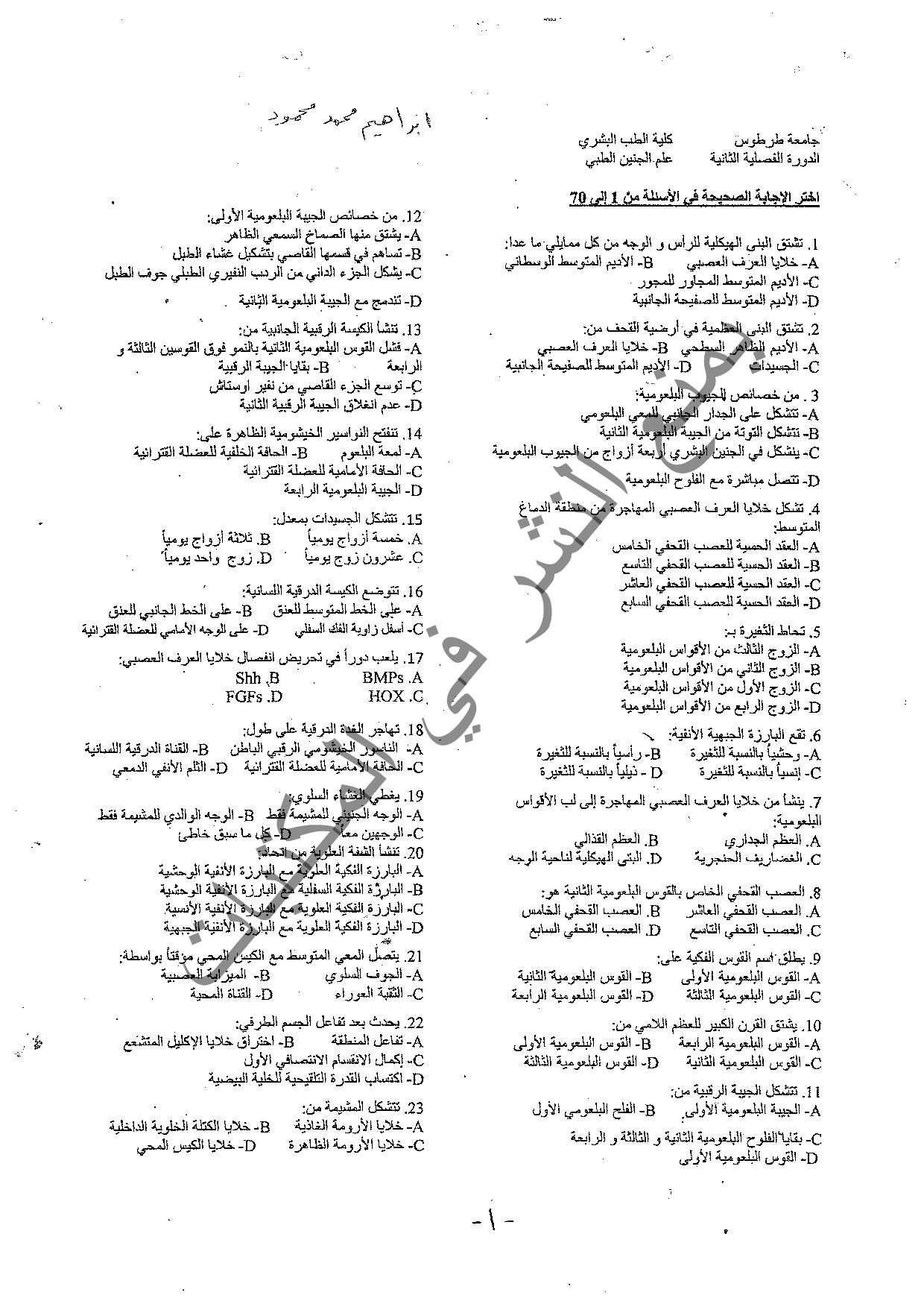 اسئلة اختبار في مادة علم الجنين الطبي للسنة2 فصل2 جامعة طرطوس كلية الطب البشري