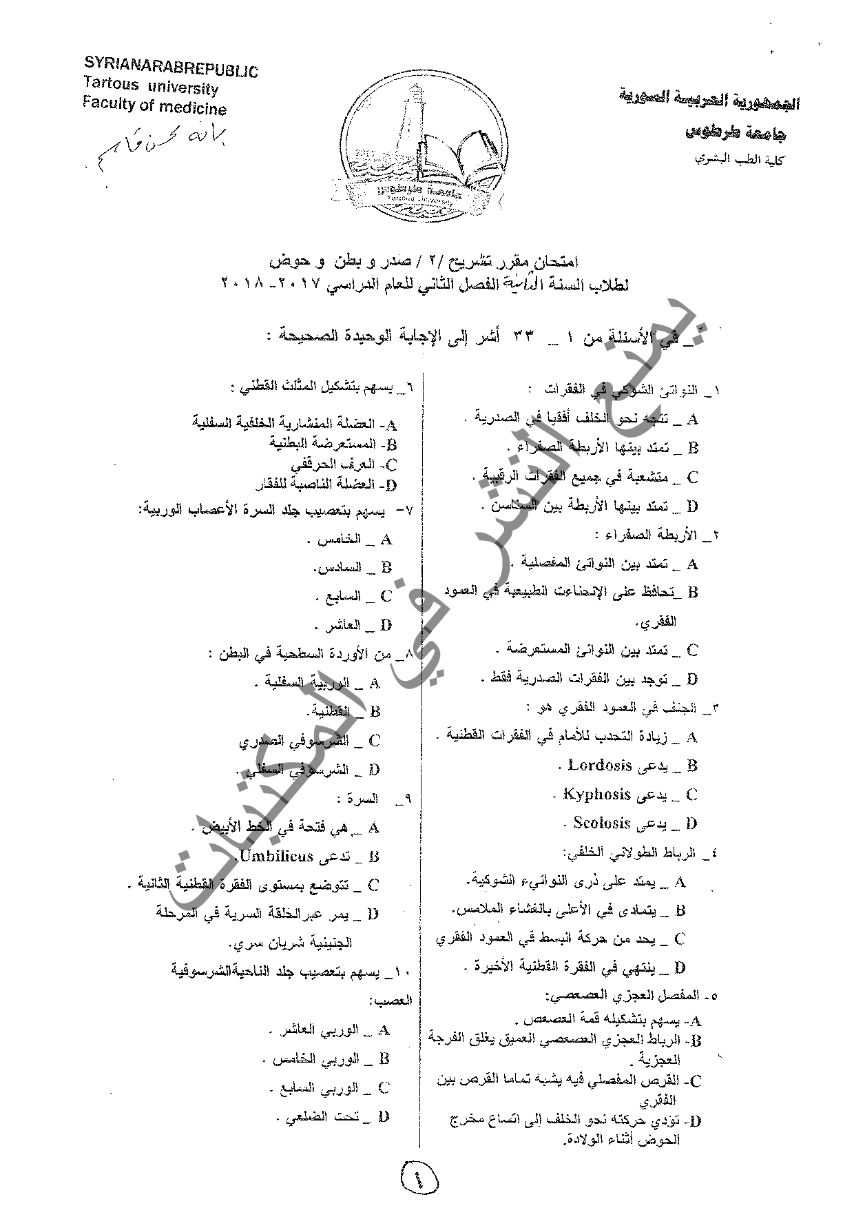 اسئلة اختبار في مادة التشريح2 للسنة2 فصل2 عام2018 جامعة طرطوس كلية الطب البشري