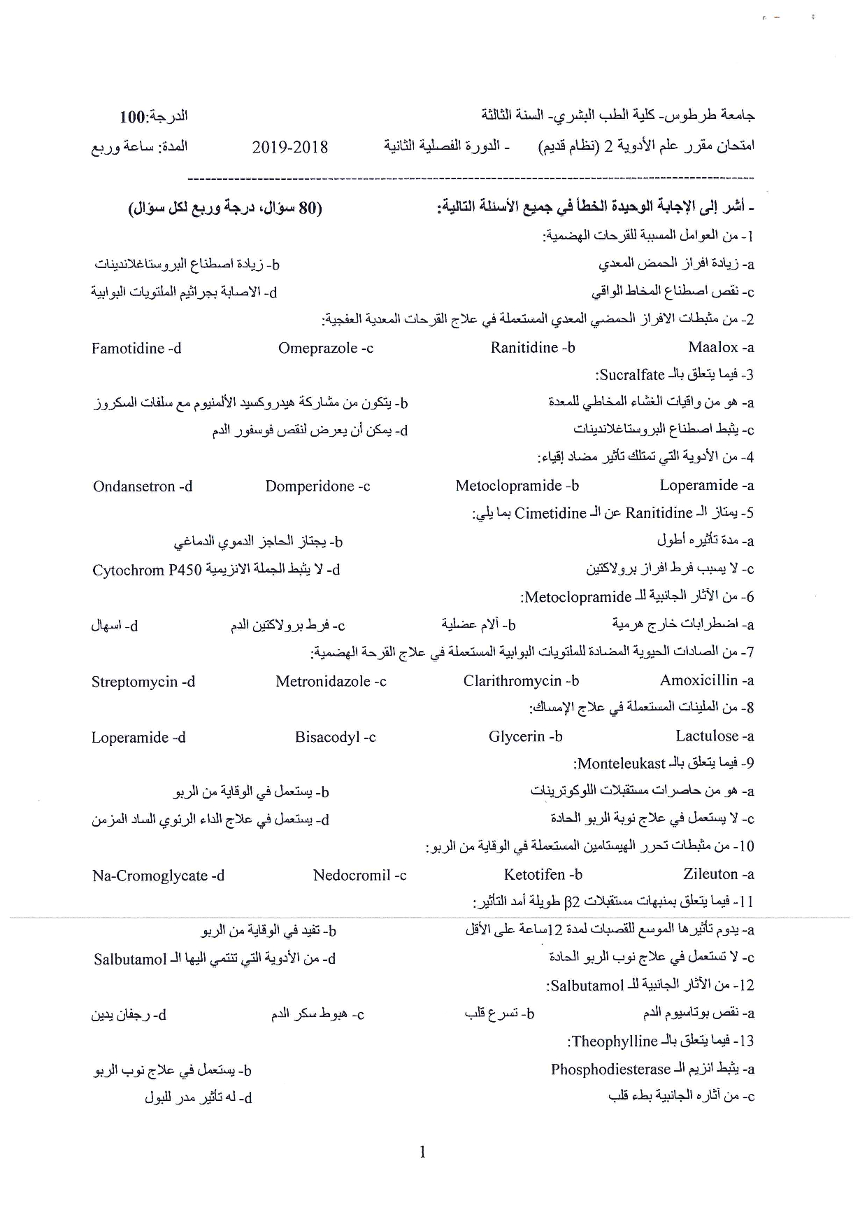 اسئلة اختبار في مادة الادوية للسنة3 فصل2 عام2019 (خطة قديمة) جامعة طرطوس كلية الطب البشري