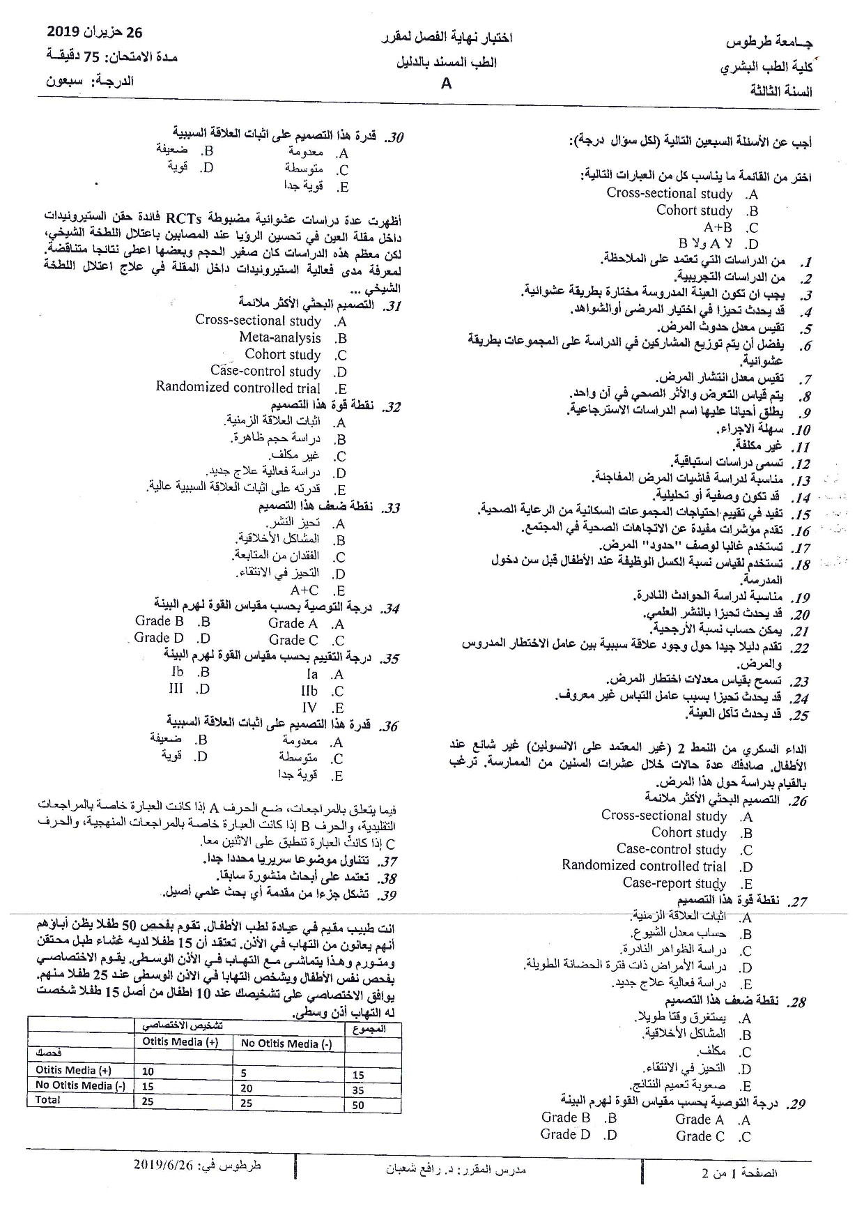 اسئلة اختبار في مادة الطب المسند بالدليل للسنة3 فصل2 عام2019 جامعة طرطوس كلية الطب البشري