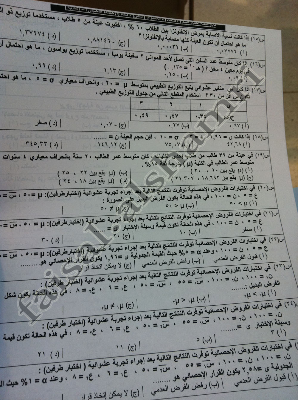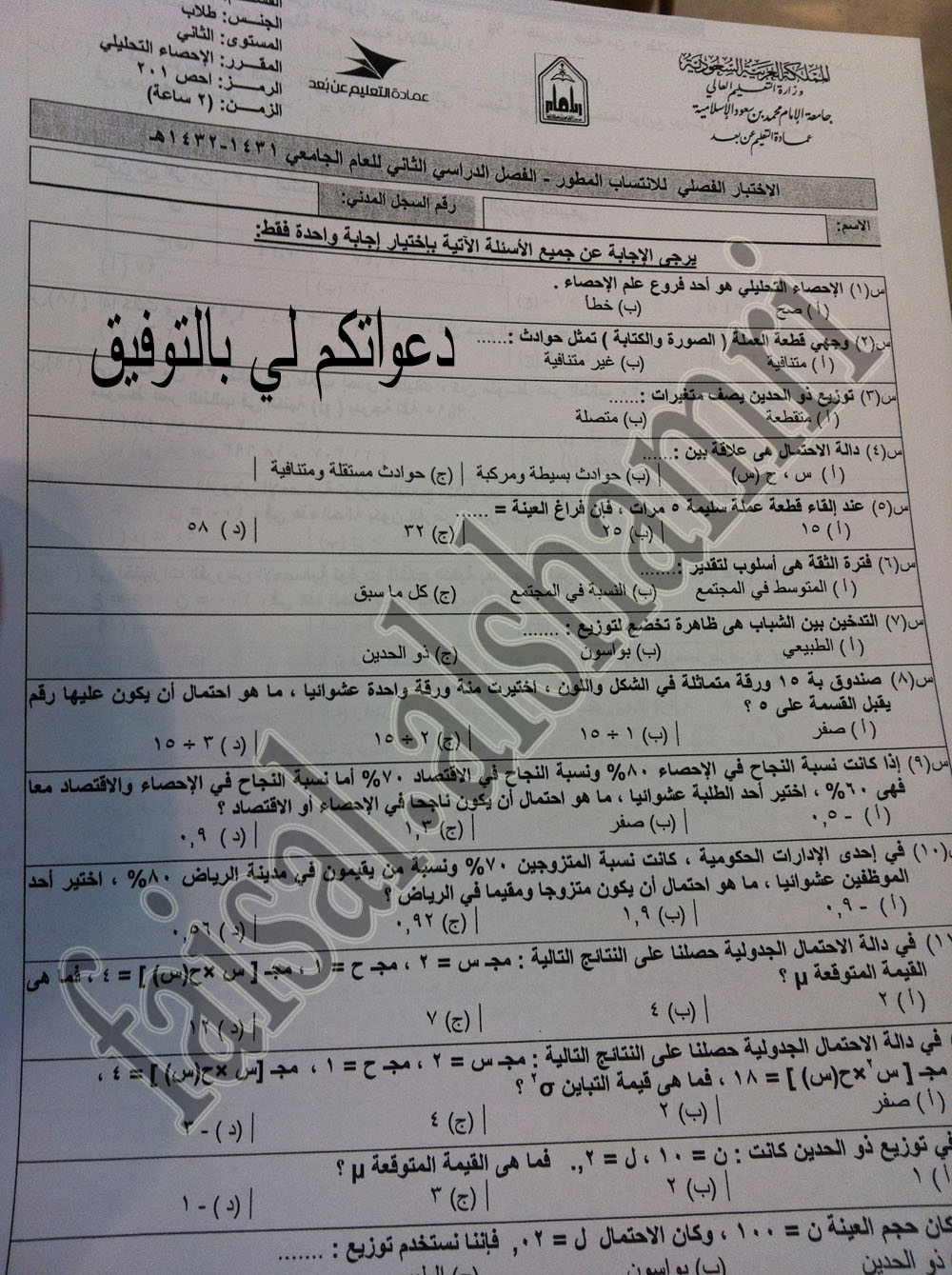 اسئلة مادة الإحصاء التحليلي احص 201 للإنتساب المطور الفصل الدراسي الثاني 1431هـ طلاب