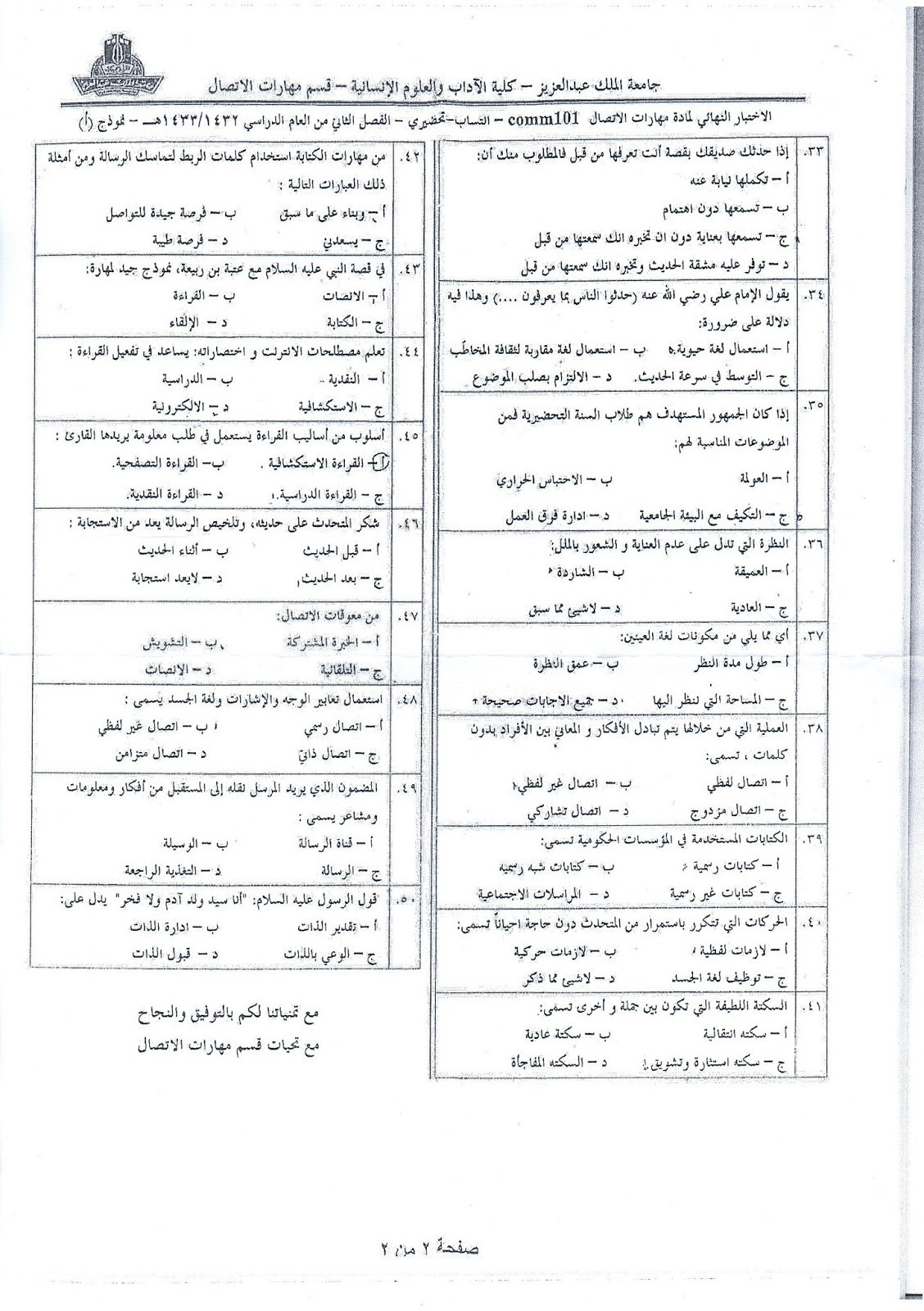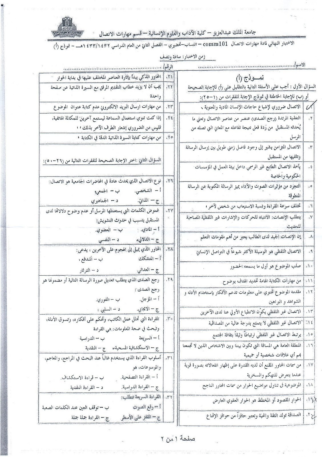 أسئلة اختبار مادة مهارات الاتصال comm 101 في الفصل الدراسي الثاني للعام الجامعي 1433هـ - نموذج أ جامعة الملك عبد العزيز