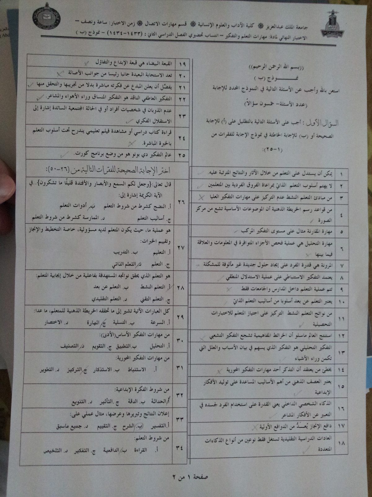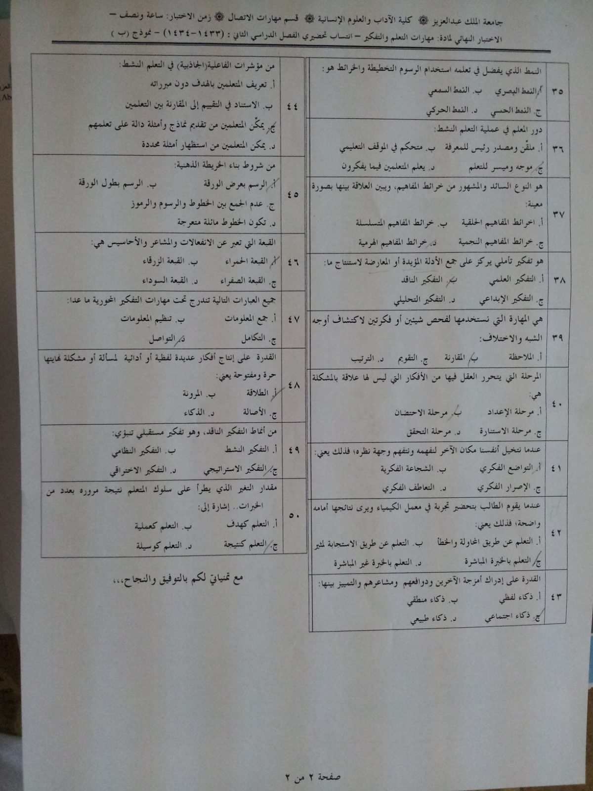 أسئلة اختبار مادة مهارات التعلم والتفكير comm102 الفصل الدراسي الثاني 1434هـ - نموذج ب