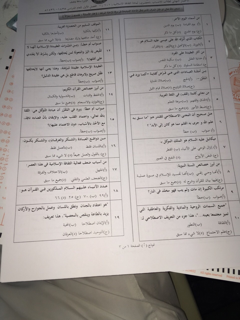 أسئلة اختبار مادة ثقافة اسلامية isls101 الفصل الدراسي الأول1436 نموذج أ