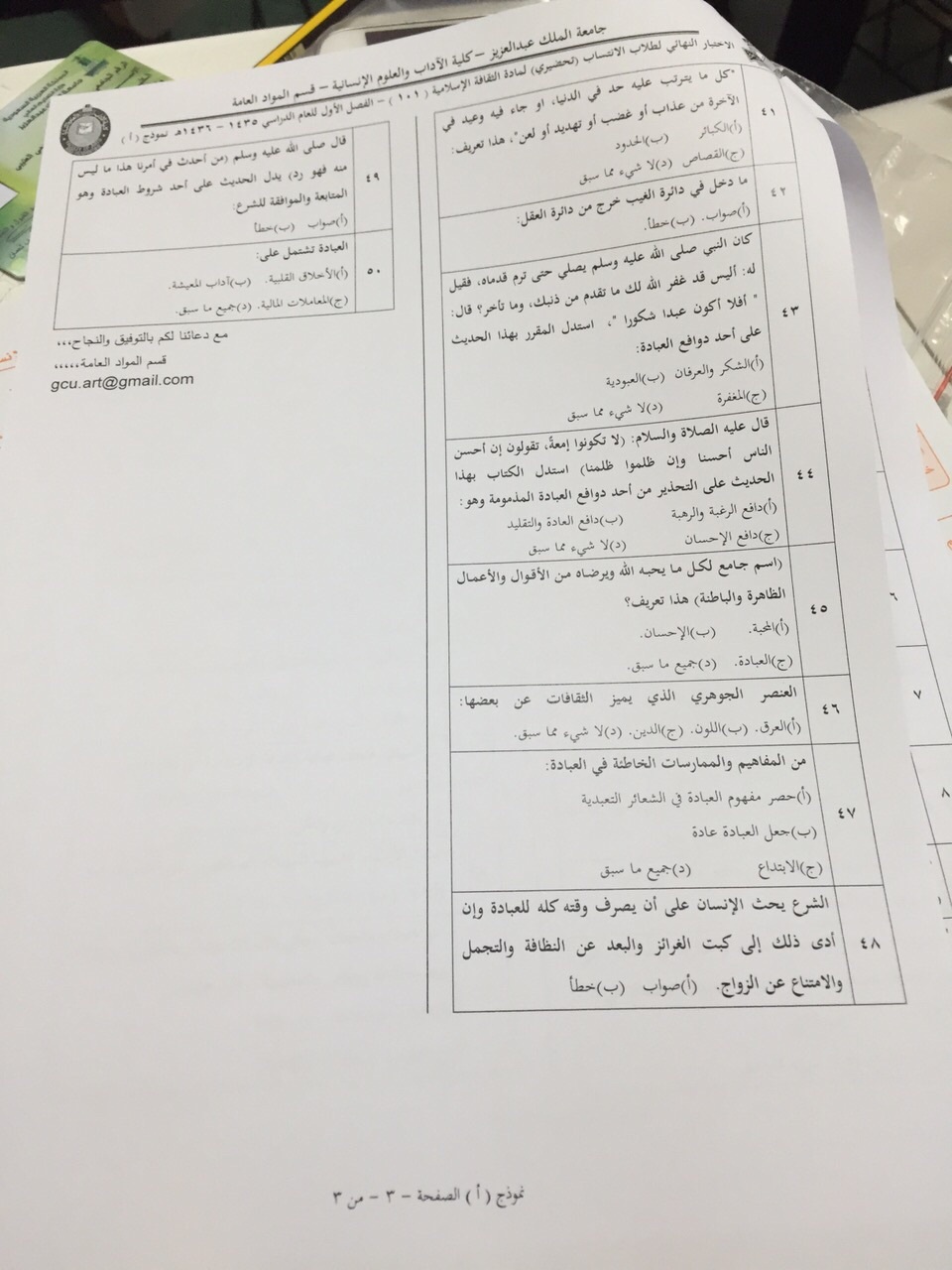 أسئلة اختبار مادة ثقافة اسلامية isls 101 الفصل الدراسي الأول1436 نموذج أ جامعة الملك عبد العزيز