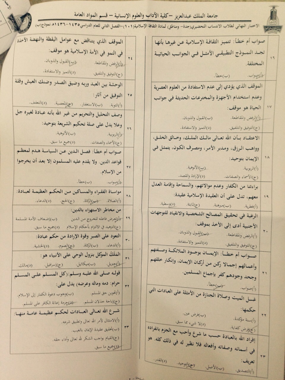 أسئلة اختبار مادة ثقافة اسلامية isls 101 الفصل الدراسي الثاني 1435 نموذج ب جامعة الملك عبد العزيز