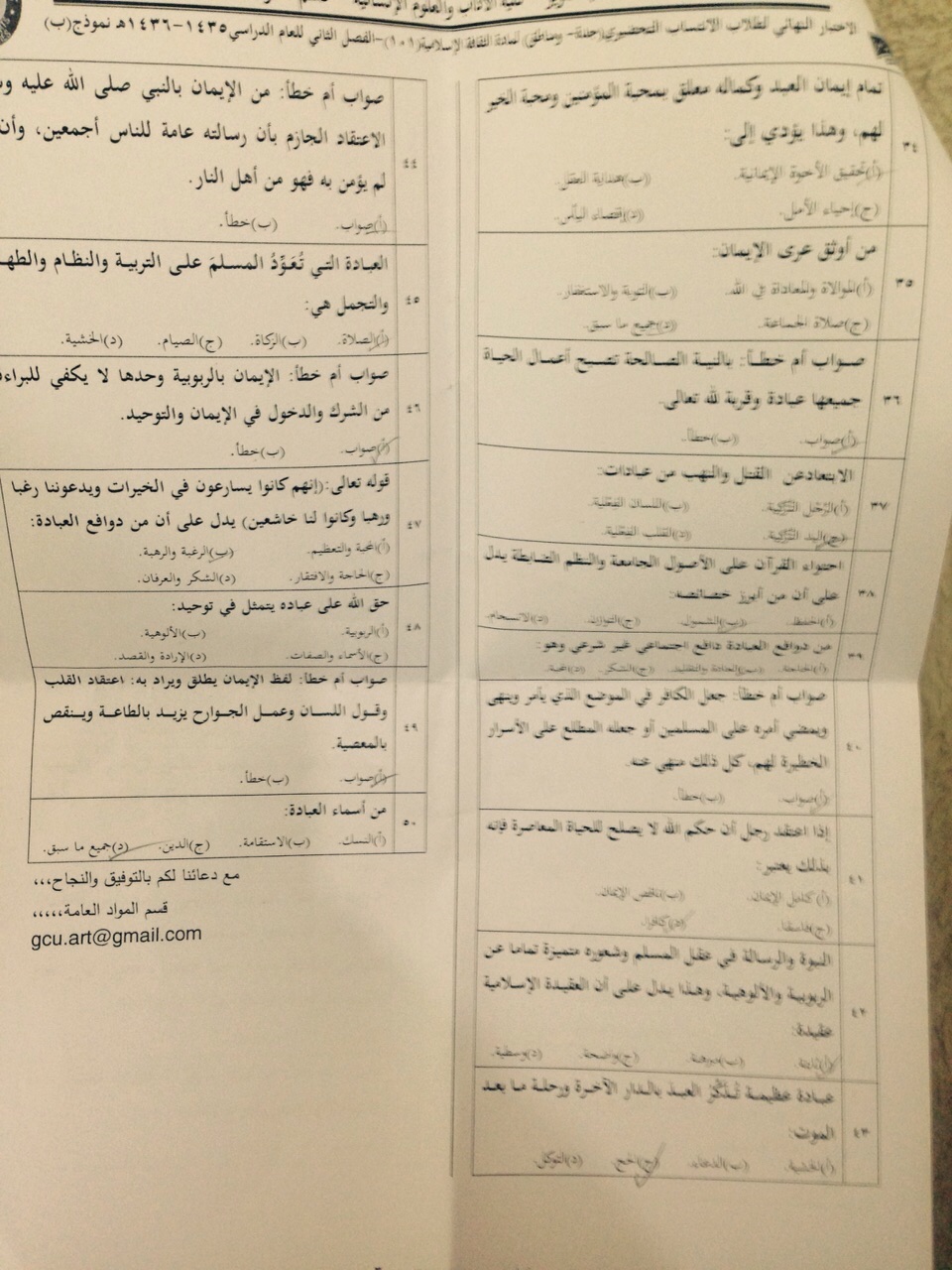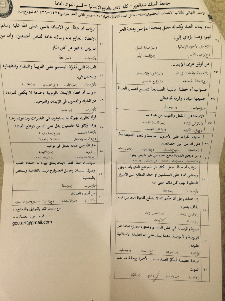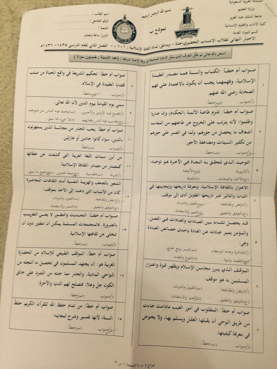 أسئلة اختبار مادة ثقافة اسلامية isls 101 الفصل الدراسي الثاني 1436 نموذج ب جامعة الملك عبد العزيز