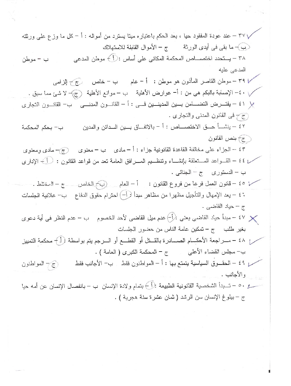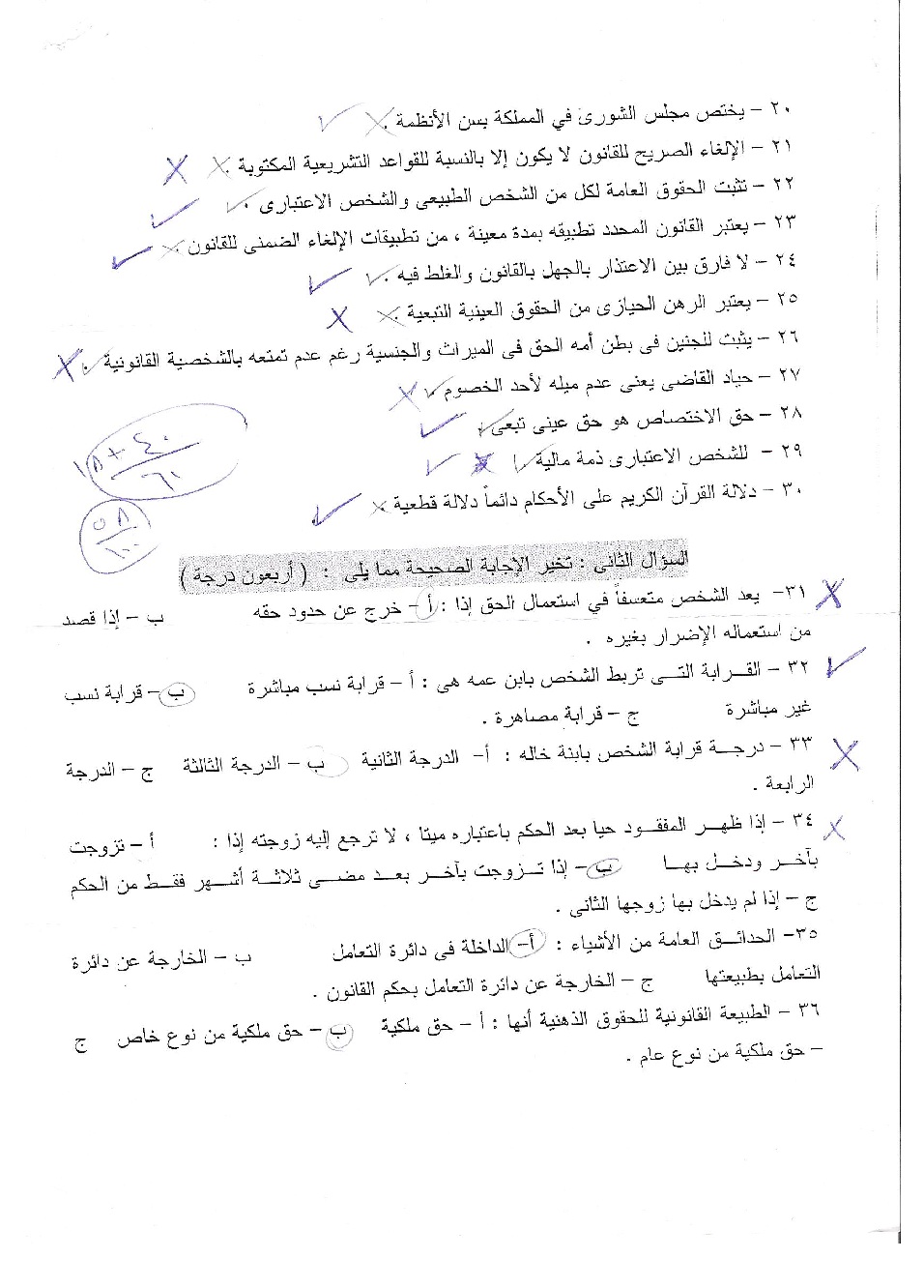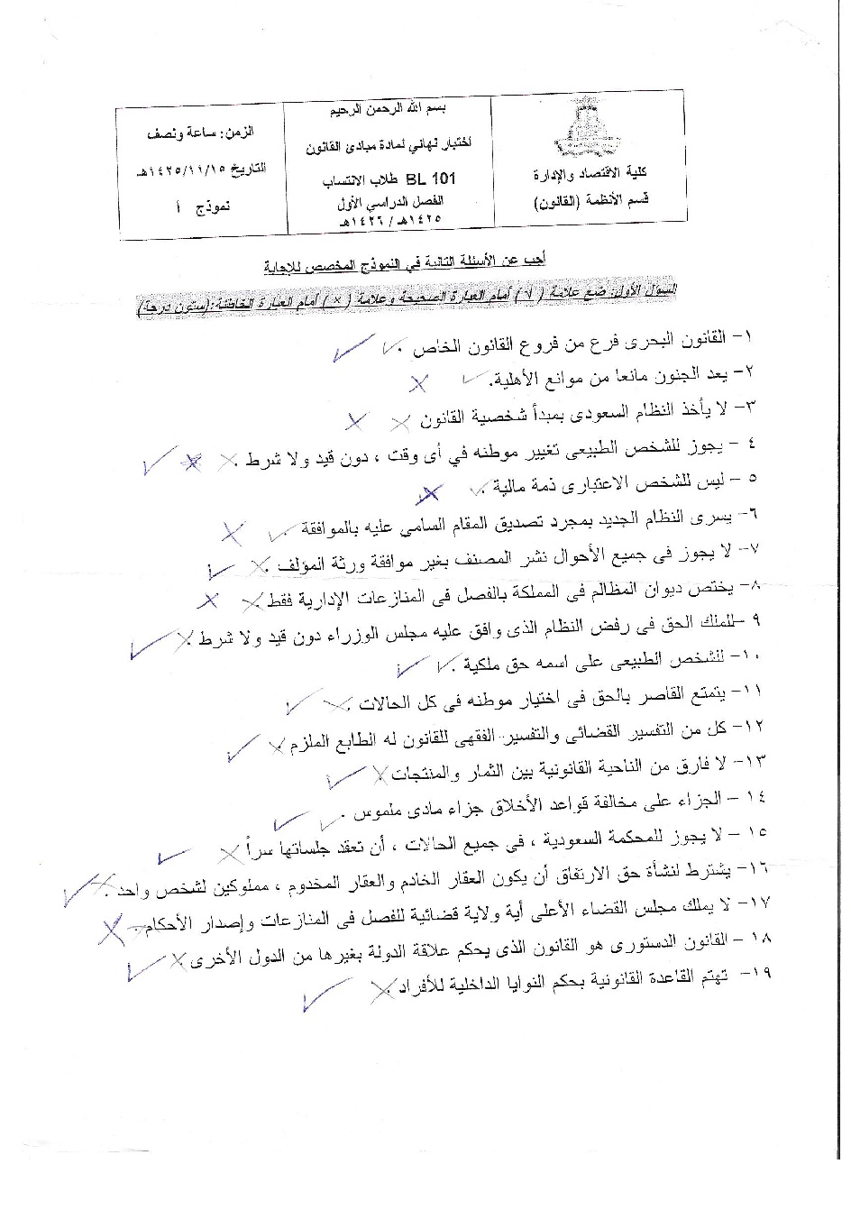 أسئلة اختبار مادة مبادئ القانون BL 101 الفصل الدراسي الأول 1425 نموذج أ جامعة الملك عبد العزيز