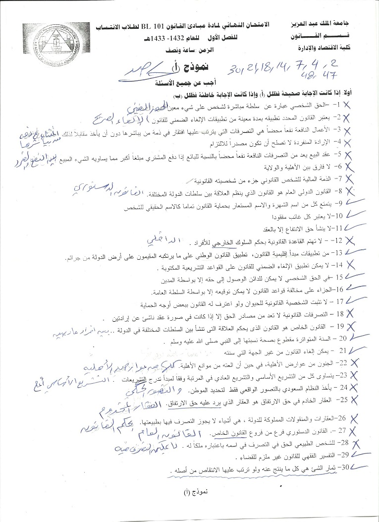 أسئلة اختبار مادة القانون التجاري BL 221 الفصل الدراسي الأول 1433 انتساب جامعة الملك عبد العزيز