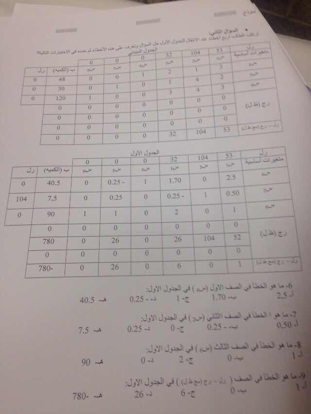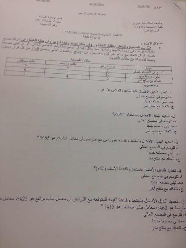 أسئلة اختبار مادة بحوث العمليات pad 351 الفصل الأول 1436 هـ نموذج أ جامعة الملك عبد العزيز