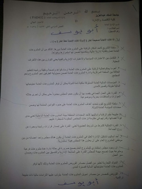 أسئلة اختبار مادة إدارة المشروعات العامة pad 432 الفصل الثاني 1434 نموذج D جامعة الملك عبد العزيز