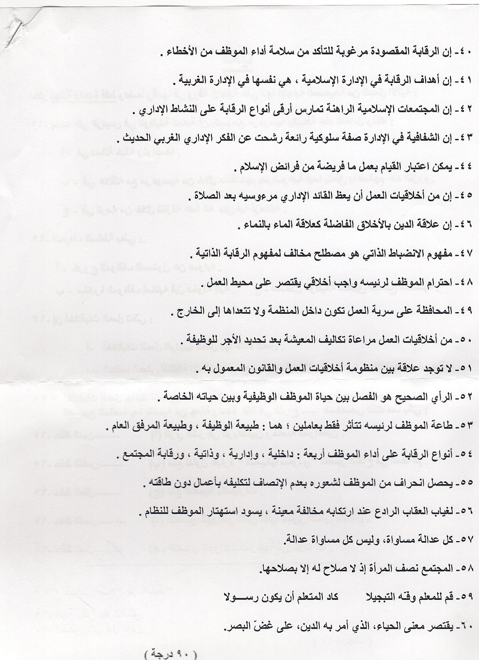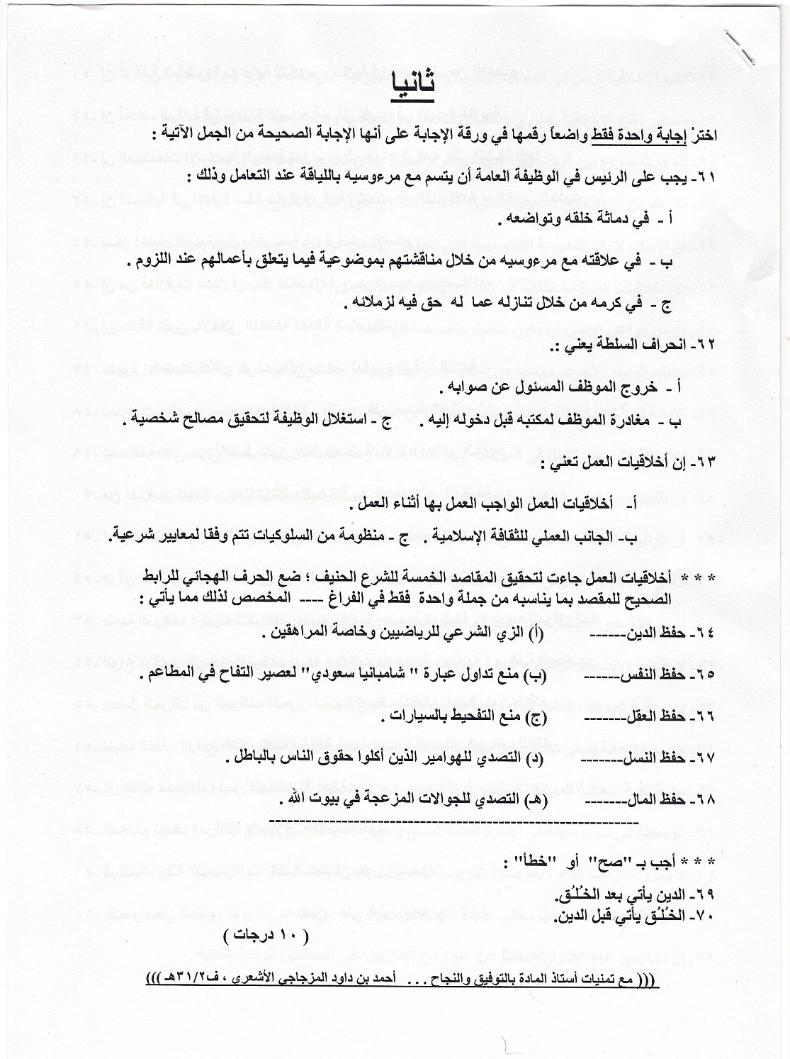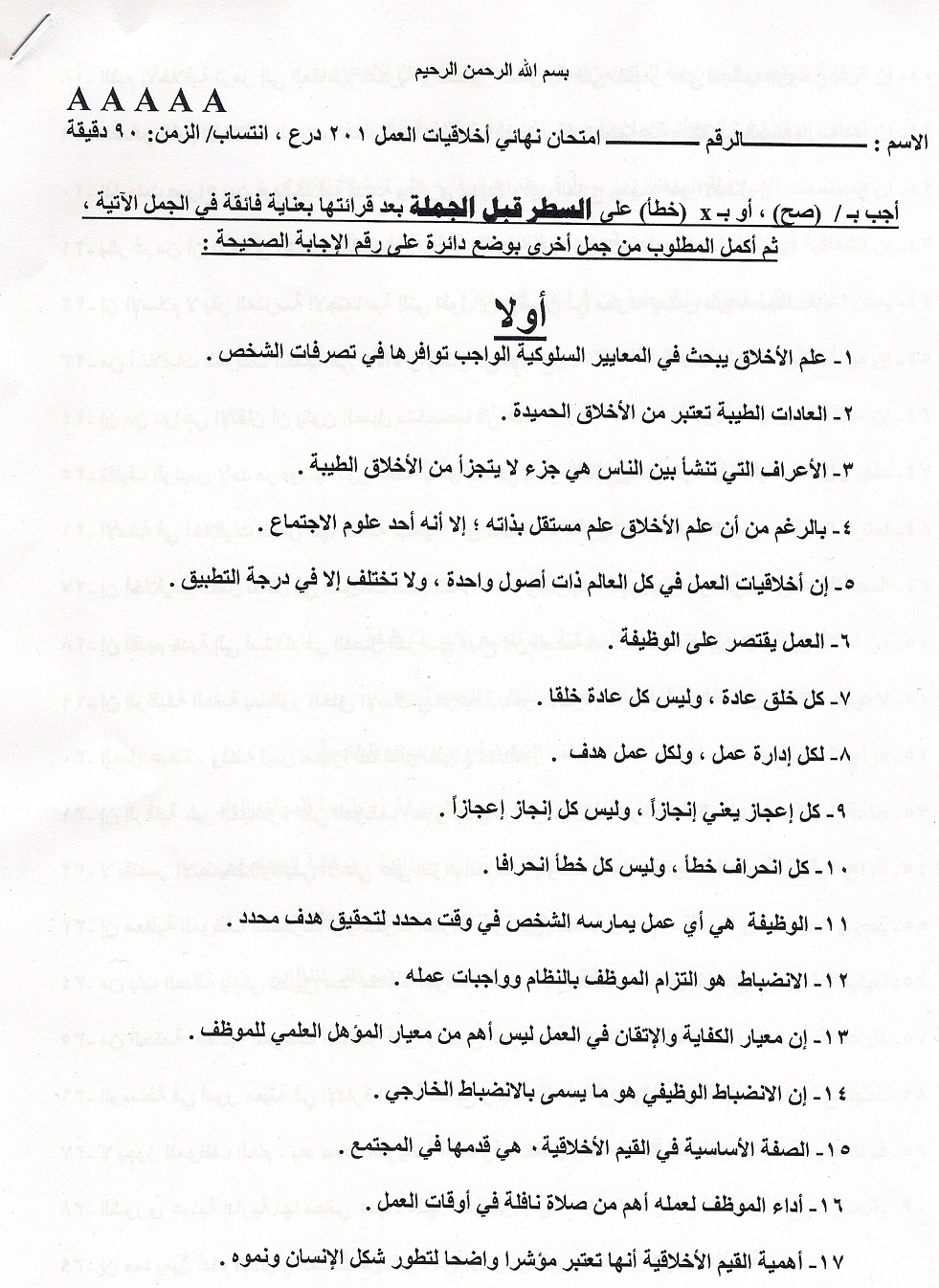 أسئلة اختبار أخلاقيات العمل PAD 201 الفصل الأول 1432 هـ نموذج أ جامعة الملك عبد العزيز