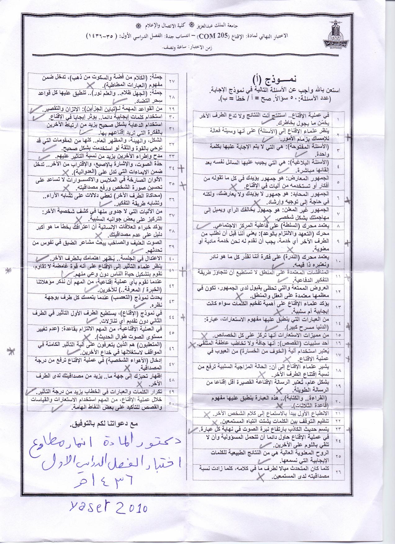 أسئلة اختبار مادة فن الاقناع com 205 الفصل الأول 1435 نموذج أ جامعة الملك عبد العزيز