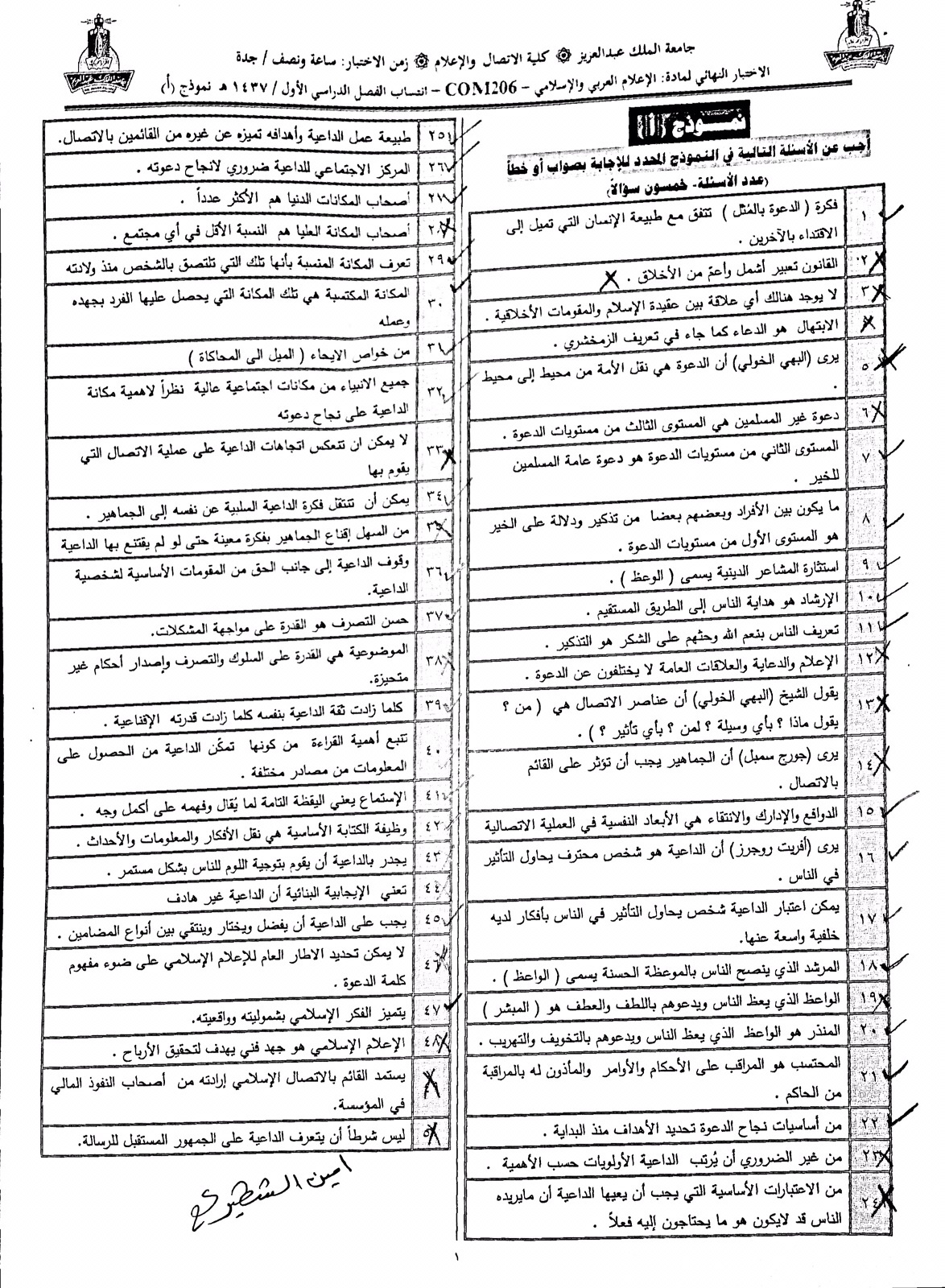أسئلة اختبار مادة الاعلام العربي والاسلامي com 206 الفصل الأول 1437هـ نموذج أ جامعة الملك عبد العزيز