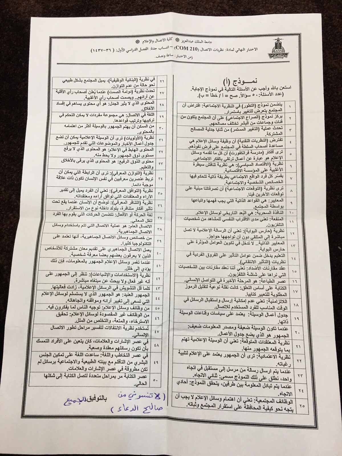 أسئلة اختبار مادة نظريات الاتصال com 210 الفصل الأول 1437هـ نموذج أ جامعة الملك عبد العزيز