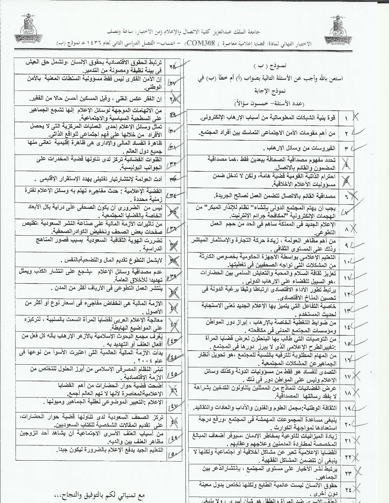 أسئلة اختبار مادة قضايا إعلامية معاصرة com 308 الفصل الثاني 1436هـ نموذج ب جامعة الملك عبد العزيز