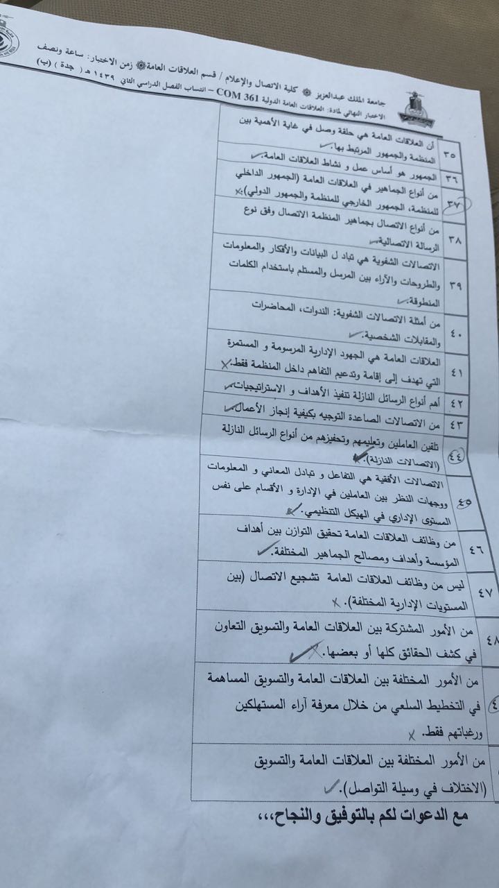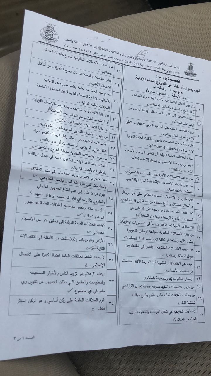 أسئلة اختبار مادة العلاقات العامة الدولية com 361 الفصل الثاني 1439هـ نموذج ب جامعة الملك عبد العزيز