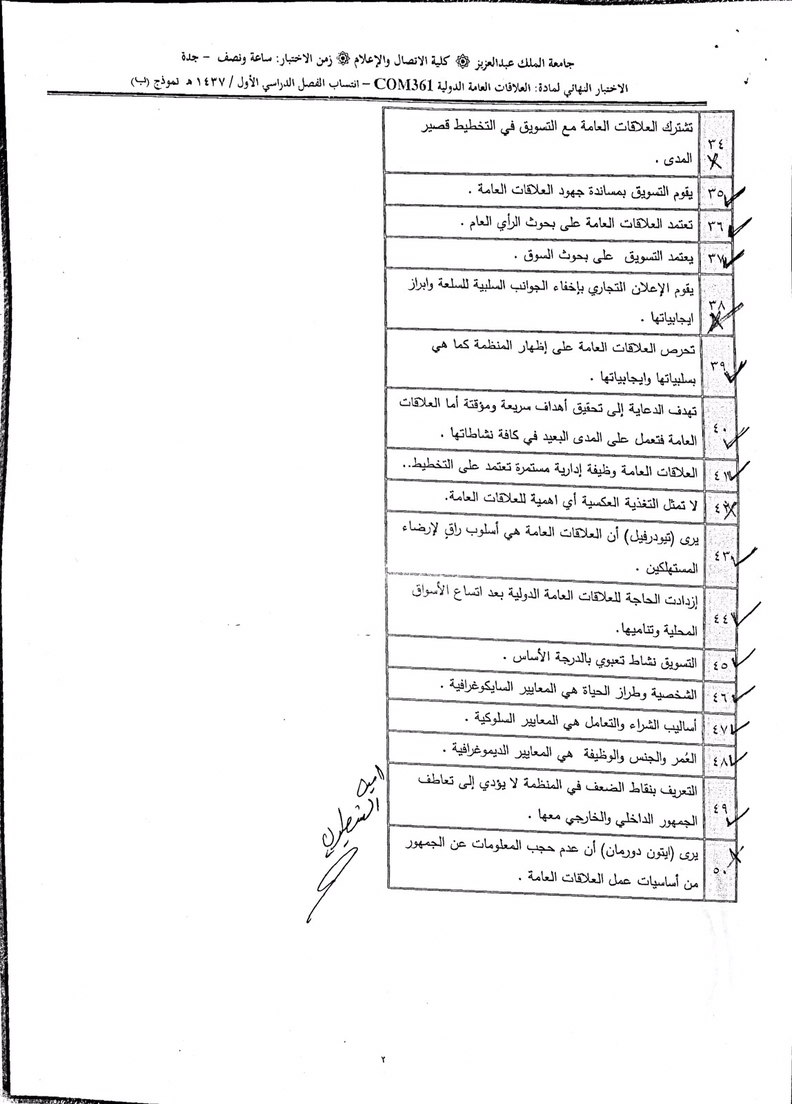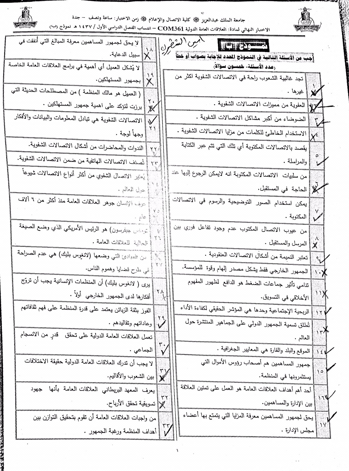 أسئلة اختبار مادة العلاقات العامة الدولية com 361 الفصل الأول 1437هـ نموذج ب جامعة الملك عبد العزيز