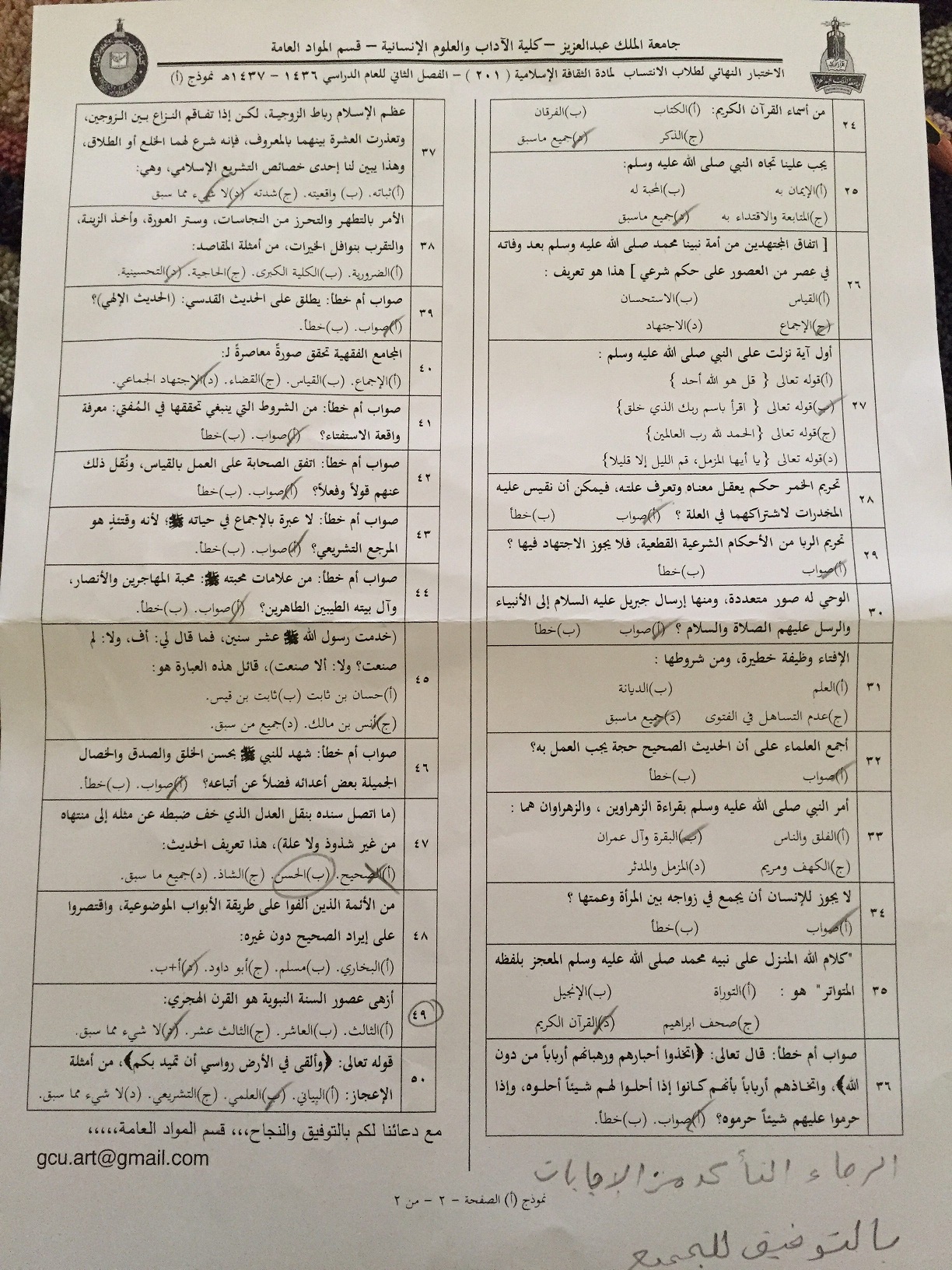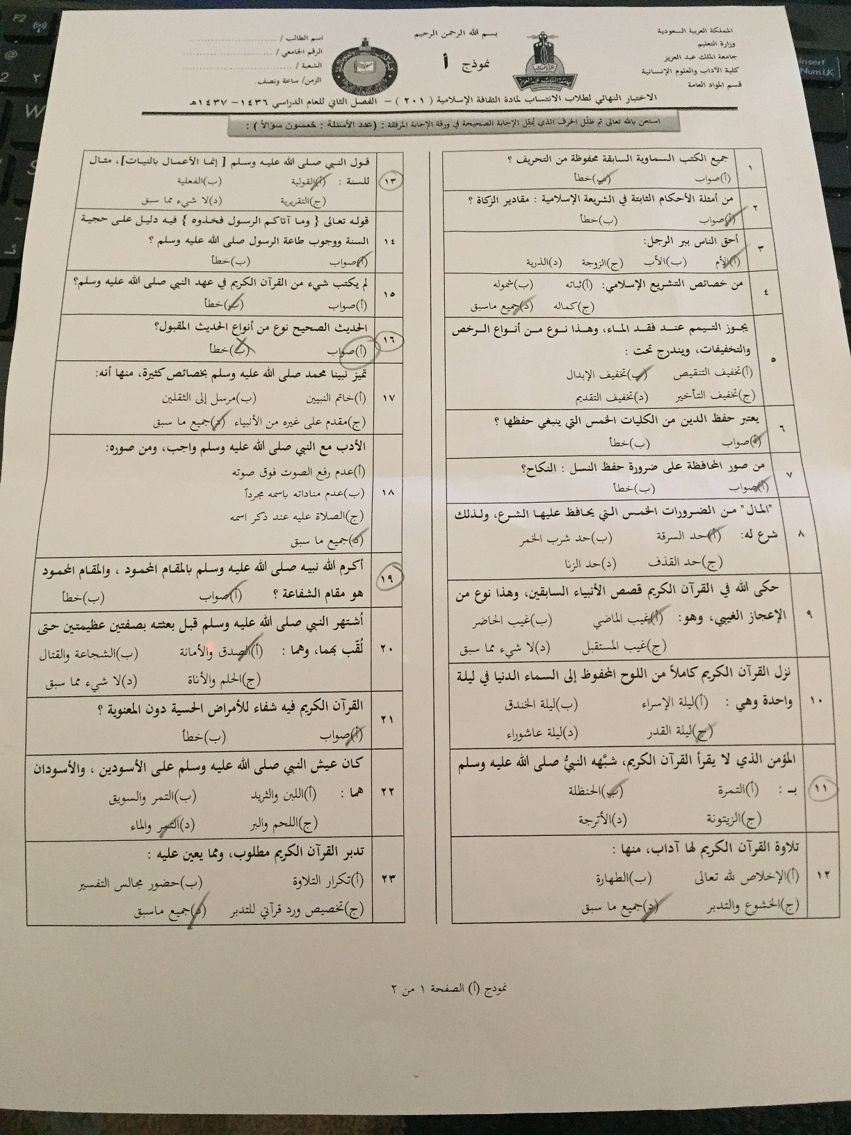 أسئلة اختبار مادة الثقافة الاسلامية isls 201 الفصل الثاني 1437هـ نموذج أ - جامعة الملك عبد العزيز