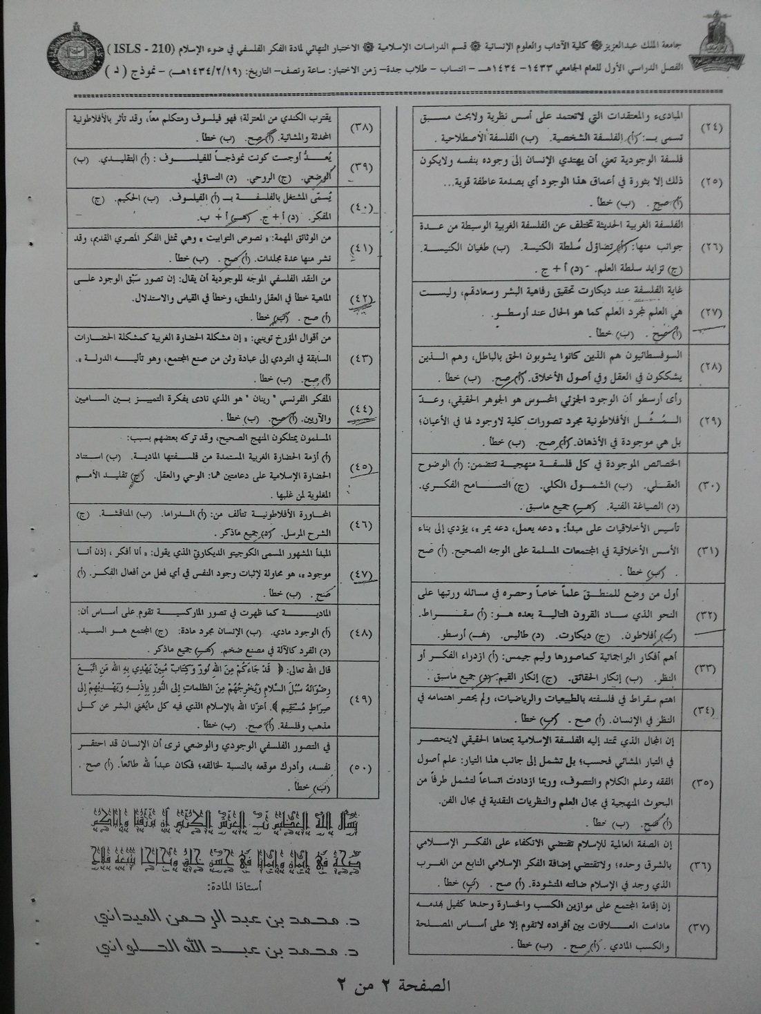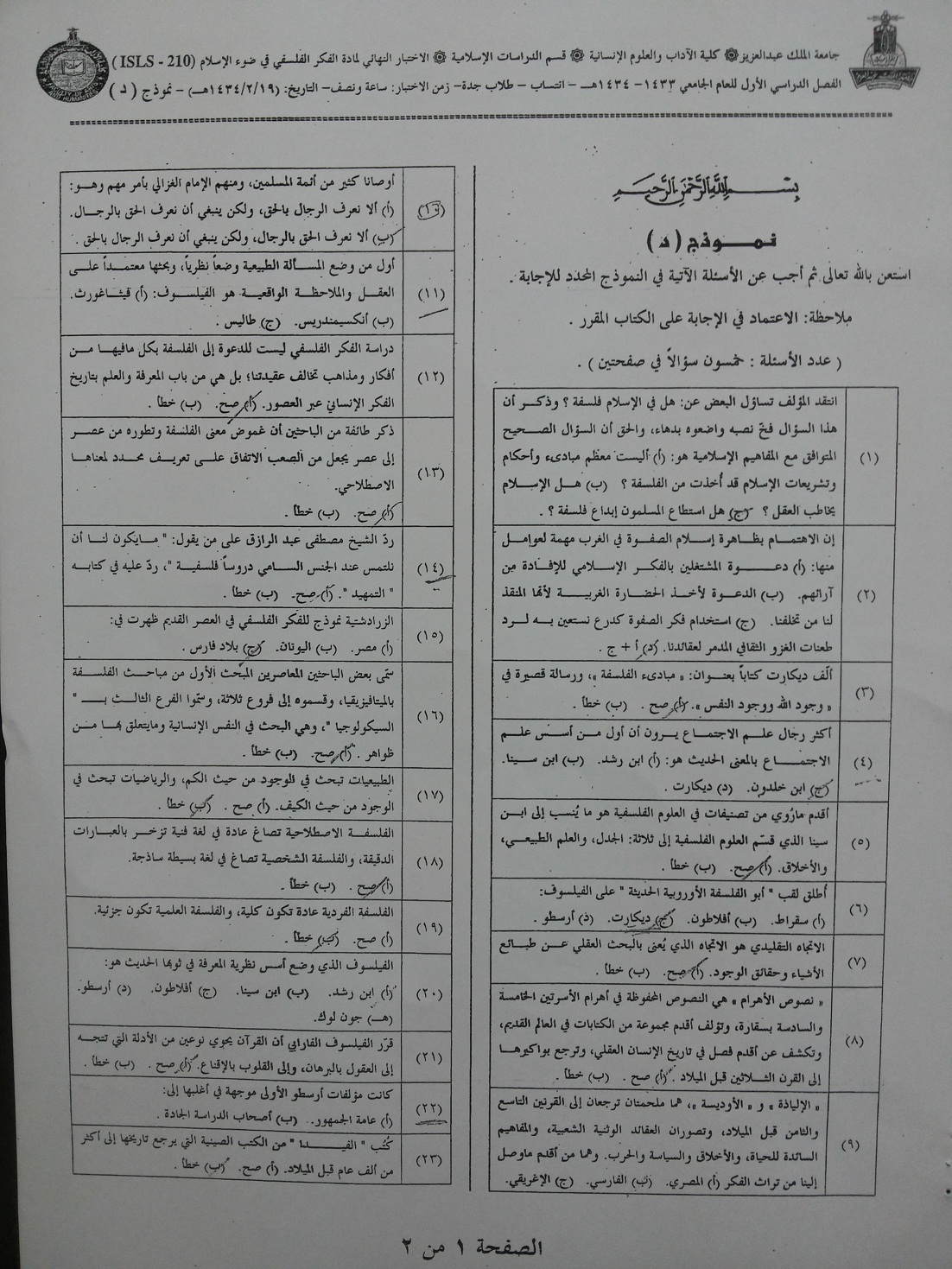 أسئلة اختبار مادة الفكر الفلسفي في ضوء الاسلام isls 210 الفصل الأول 1433هـ نموذج د - جامعة الملك عبد العزيز