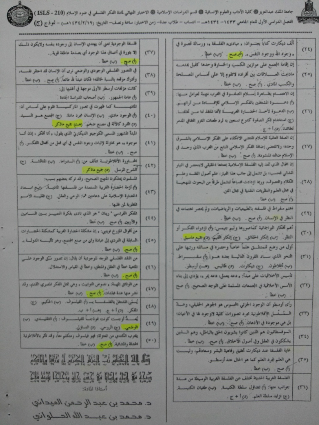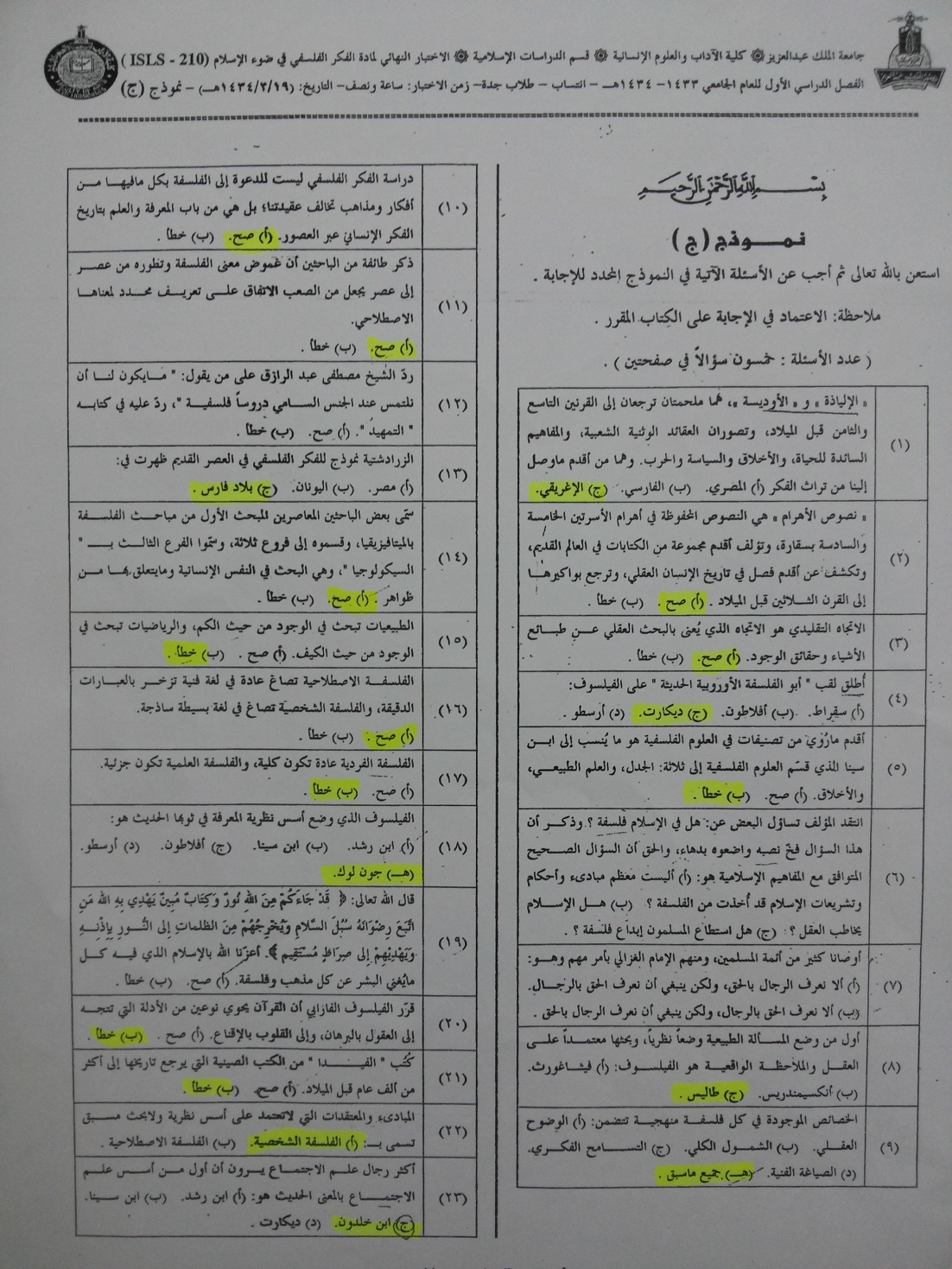 أسئلة اختبار مادة الفكر الفلسفي في ضوء الاسلام isls 210 الفصل الأول 1433هـ نموذج ج - جامعة الملك عبد العزيز