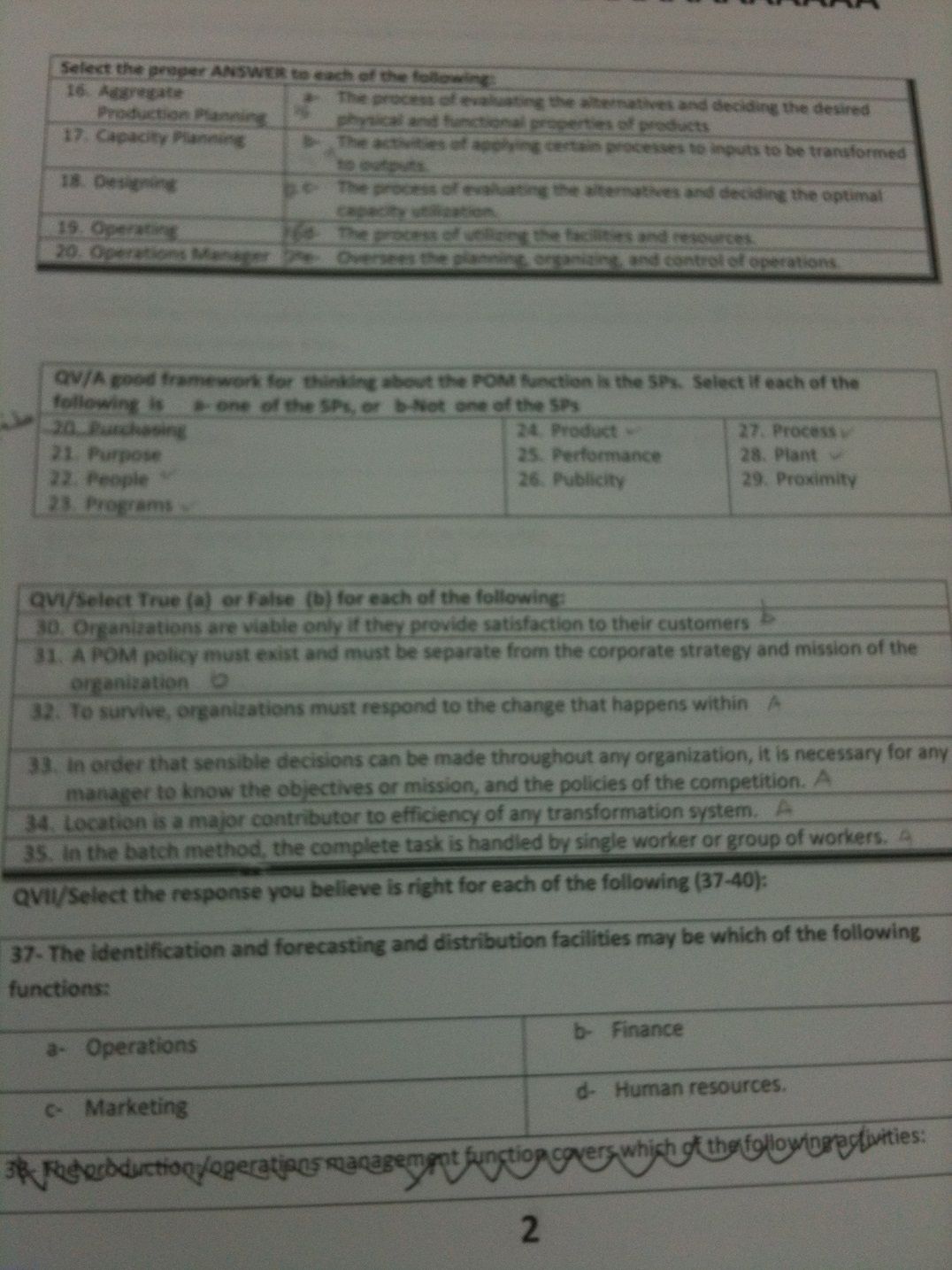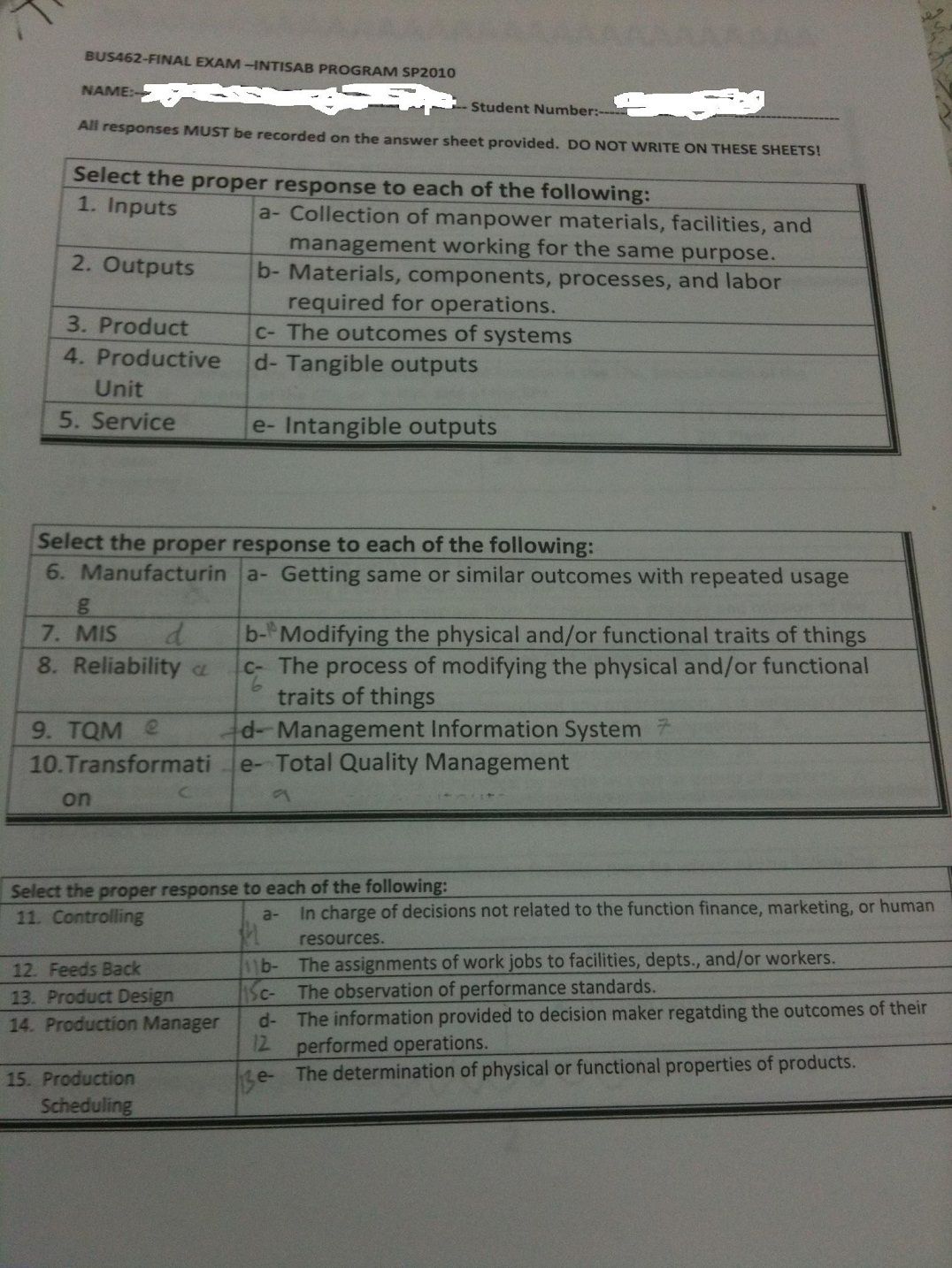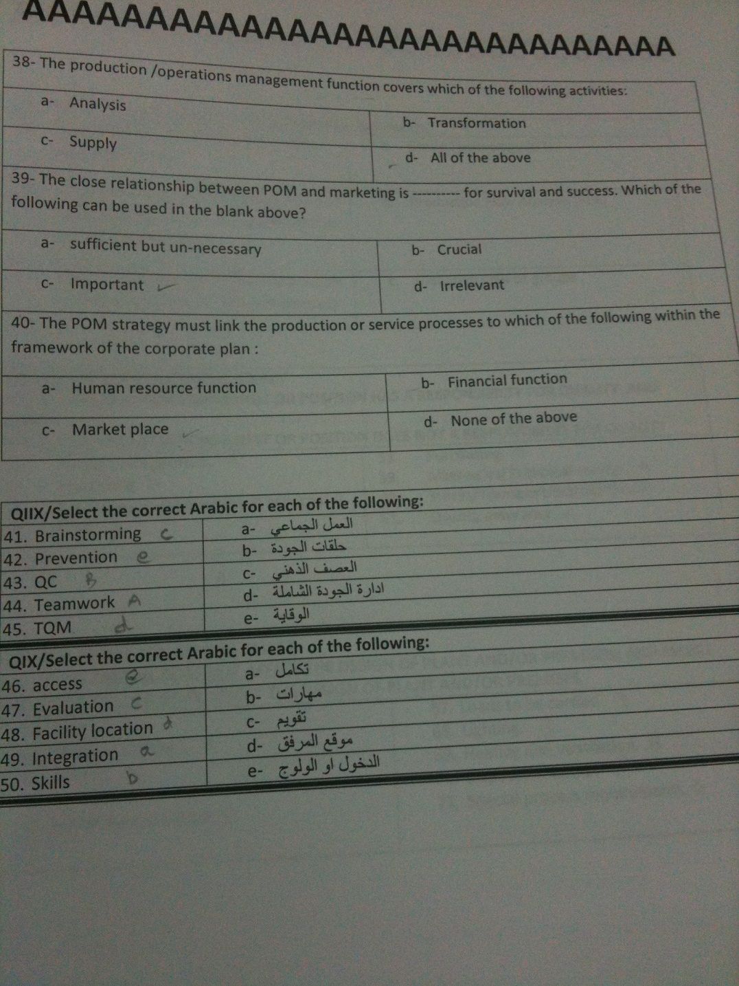 أسئلة اختبار مادة ادارة العمليات والجودة بالانجليزي BUS462 للعام الدراسي2010 نموذج أ