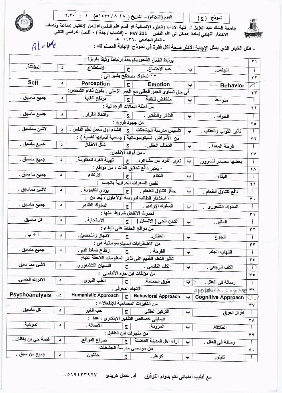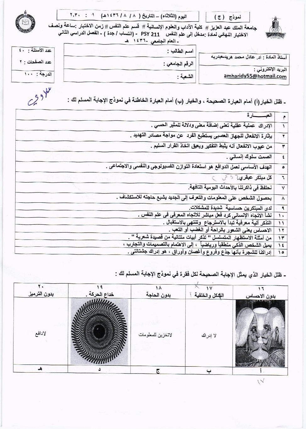 أسئلة اختبار المدخل إلى علم النفس PSY 211 للفصل الثاني 1436 نموذج ج - جامعة الملك عبد العزيز