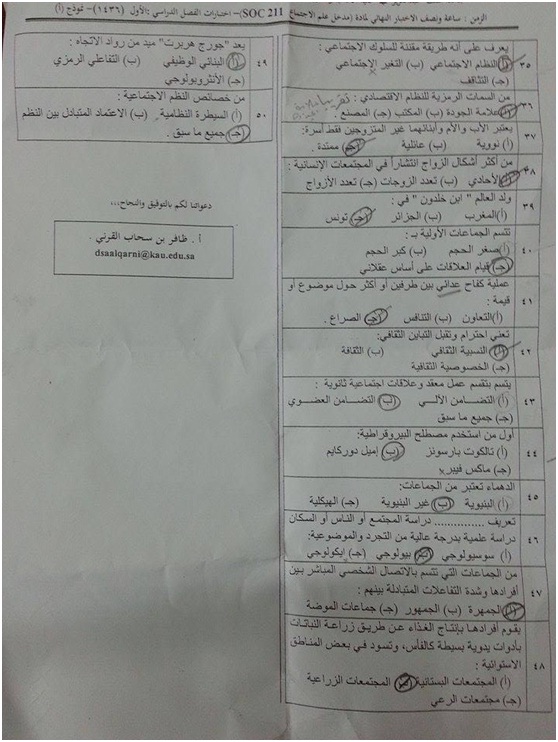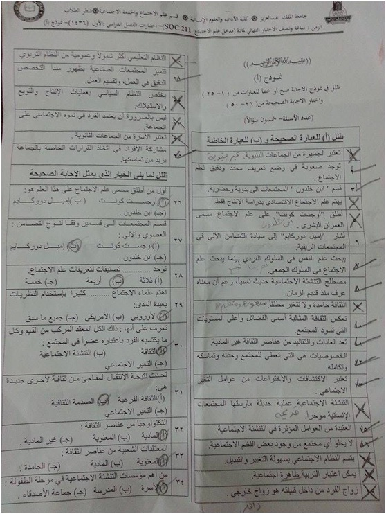 أسئلة الاختبار النهائي لمادة المدخل إلى علم الاجتماع SOC 211 نموذج أ - جامعة الملك عبد العزيز