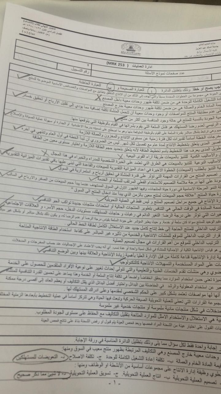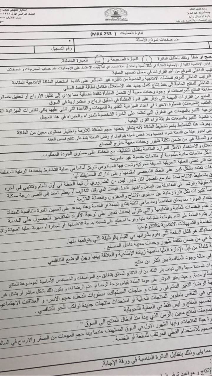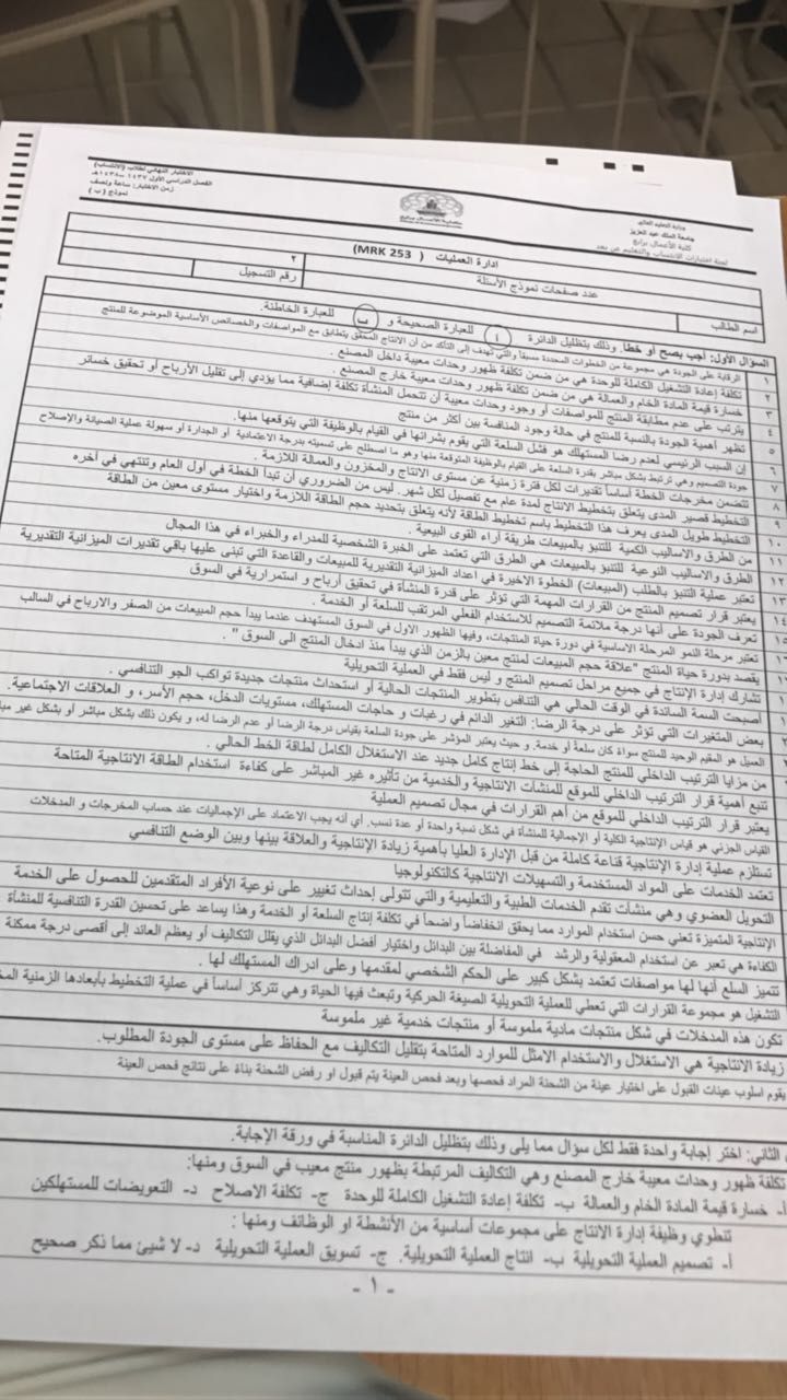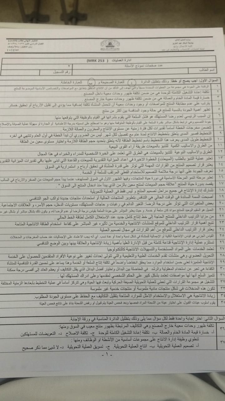 أسئلة اختبار مادة إدارة الانتاج والعمليات MRK 253 الفصل الأول 1438هـ نموذج ب - جامعة الملك عبد العزيز