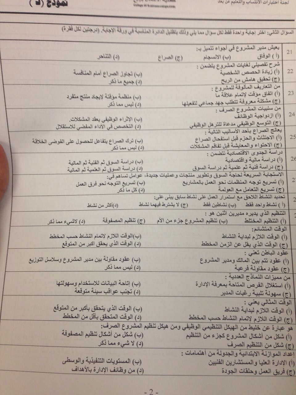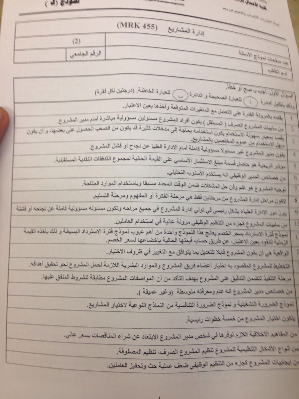 أسئلة اختبار مادة إدارة المشاريع MRK 455 الفصل الثاني 1437هـ نموذج د - جامعة الملك عبد العزيز