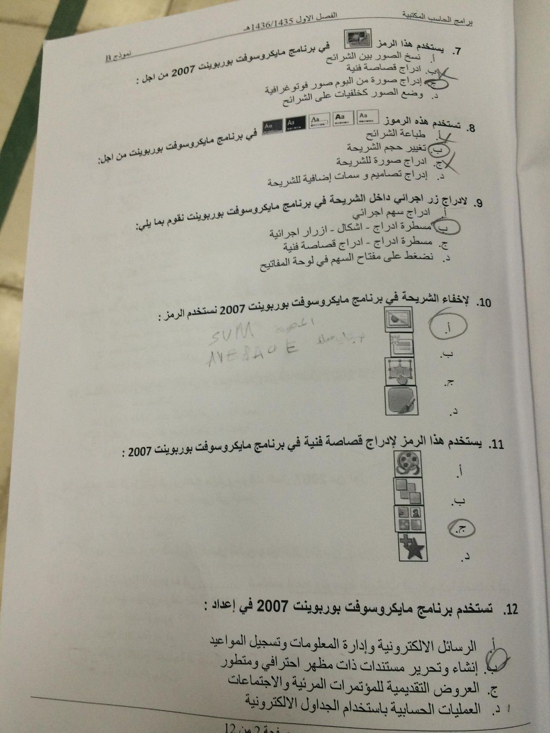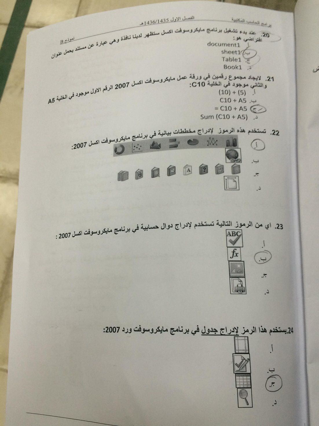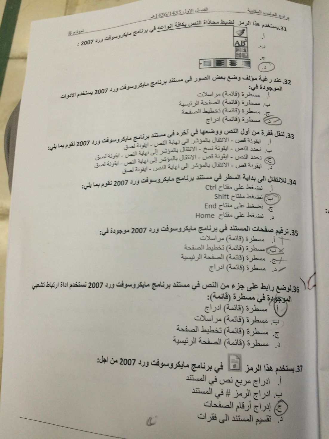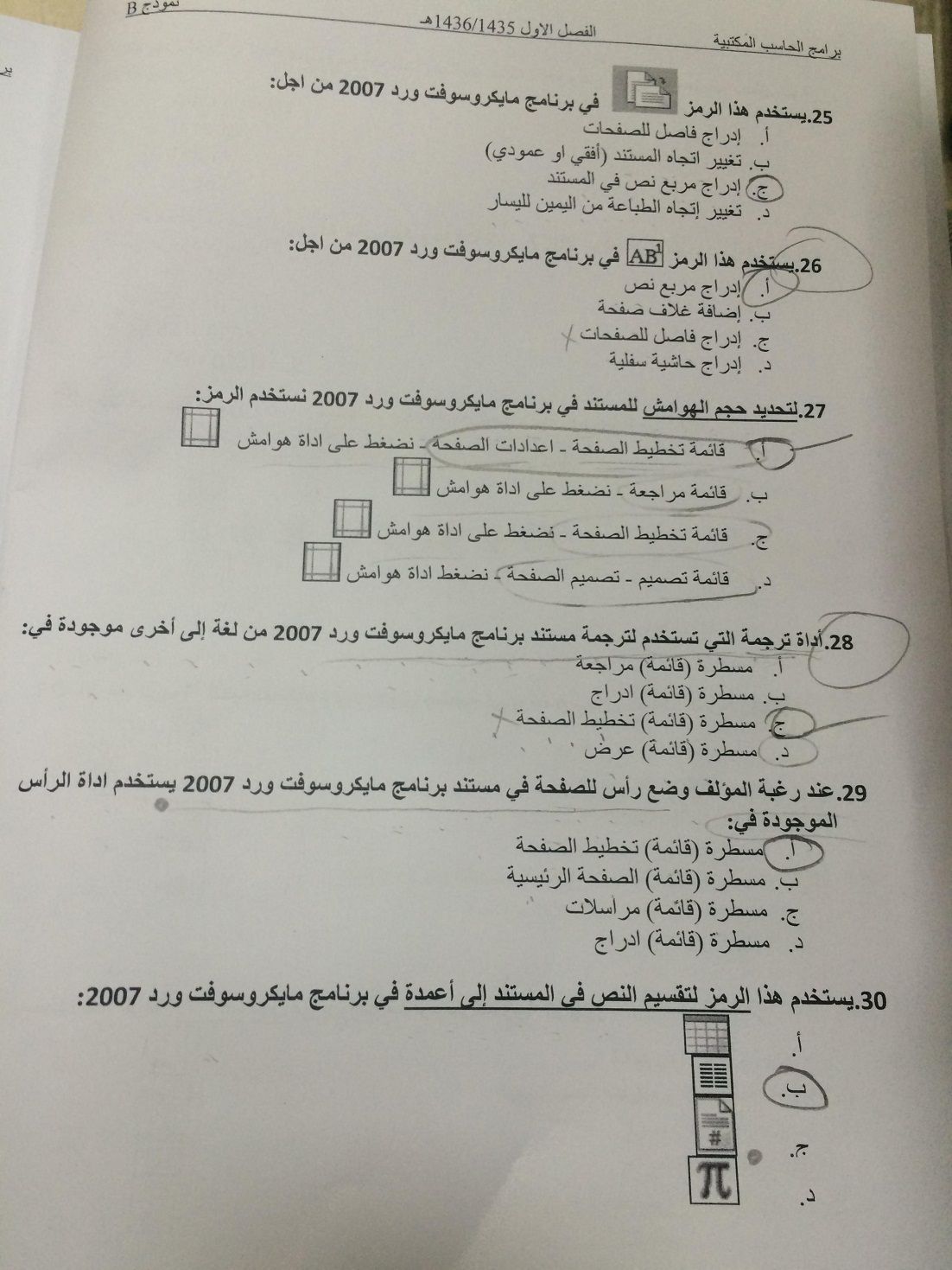 اسئلة اختبار برامج الحاسب المكتبية الفصل الدراسي الأول 1436هـ نموذج (B)