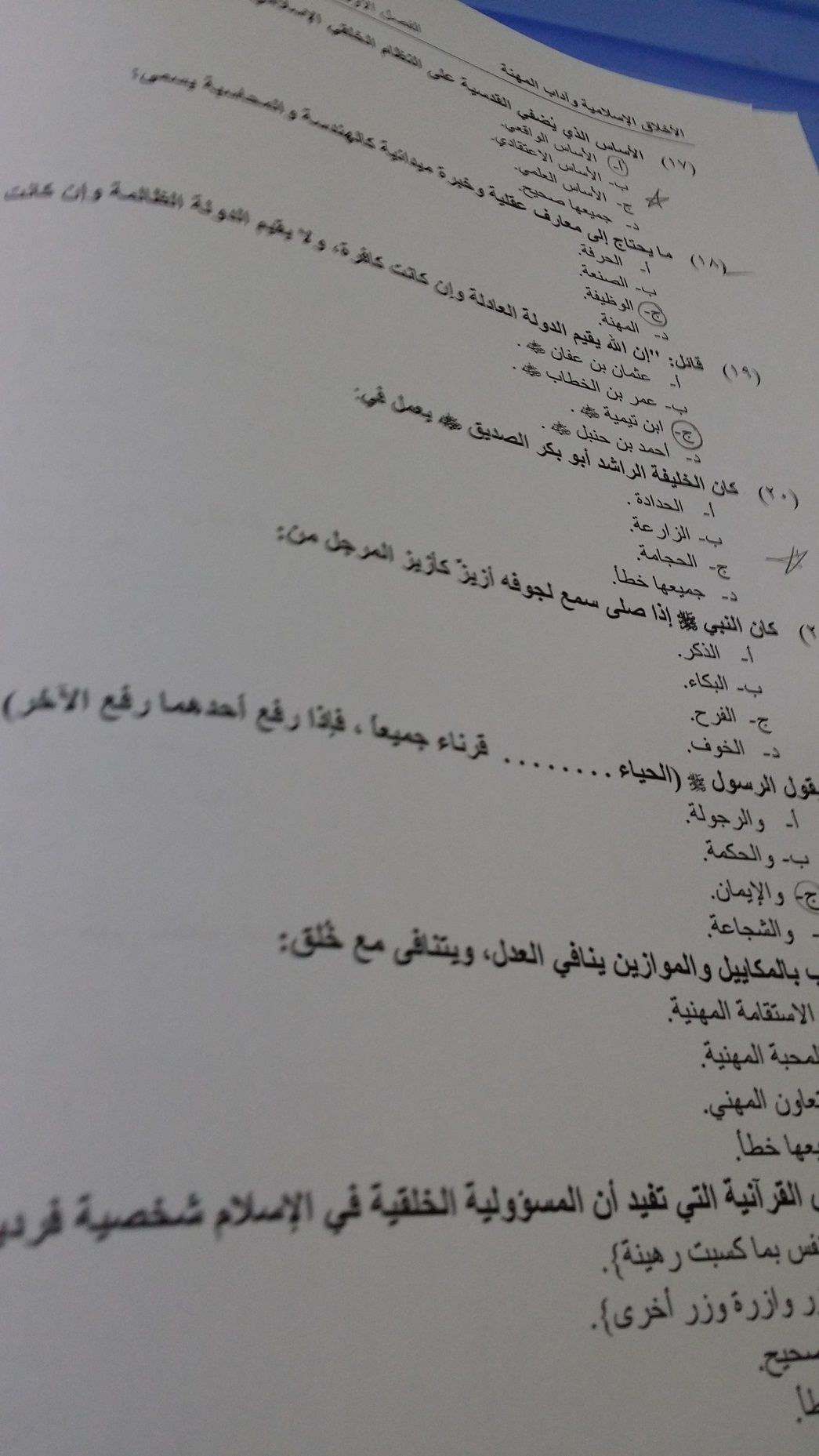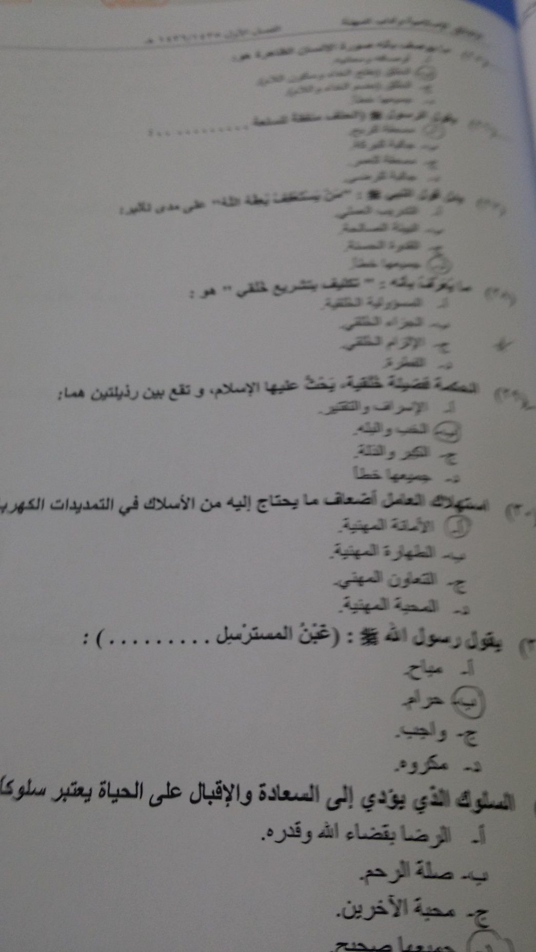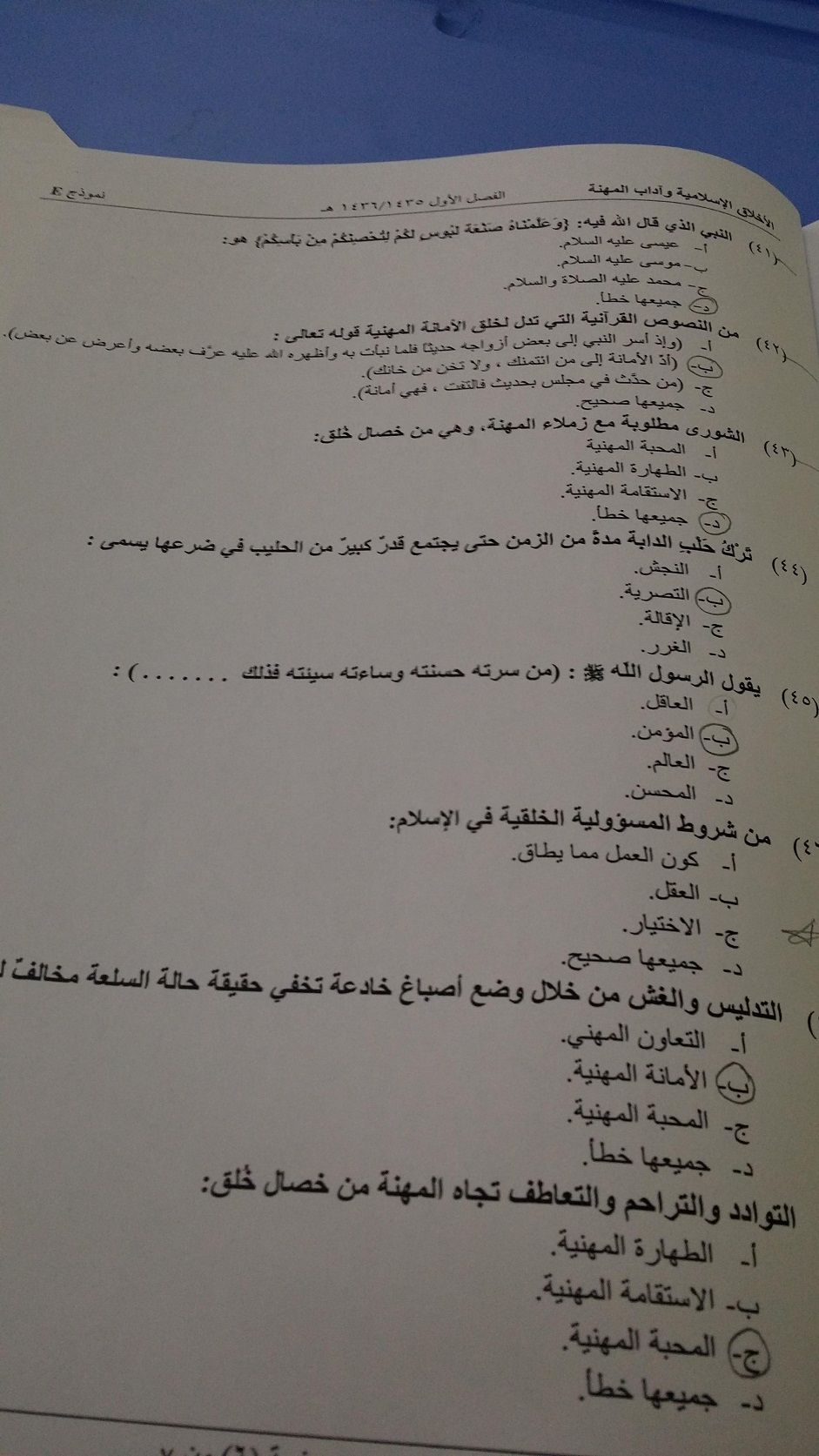 اسئلة اختبار الأخلاق الإسلامية وآداب المهنة الفصل الدراسي الأول 1436هـ نموذج (E)