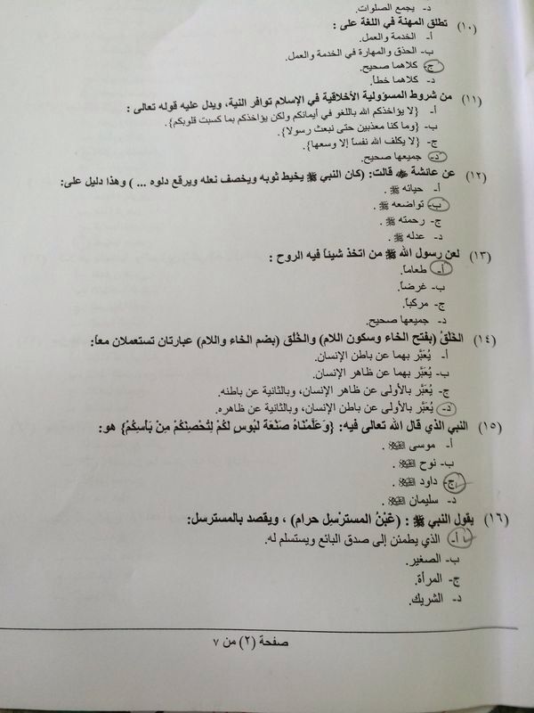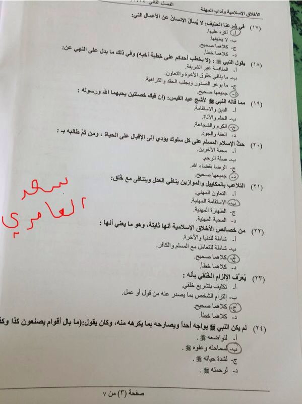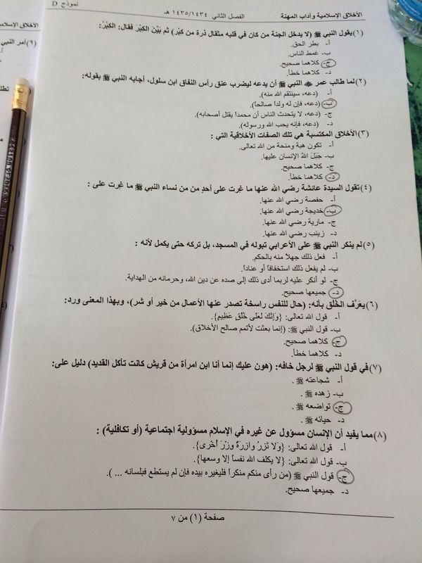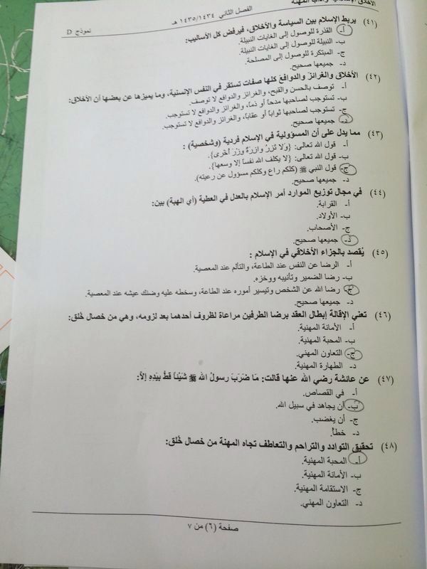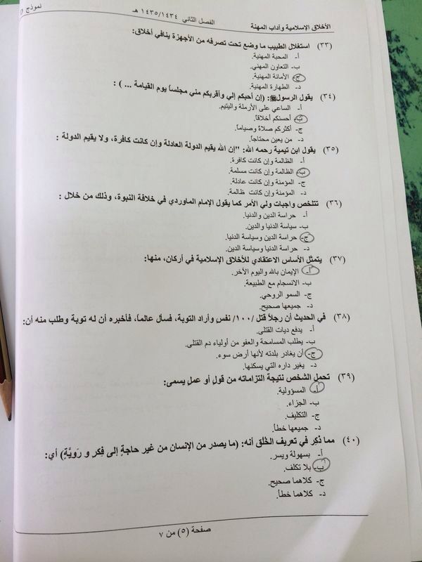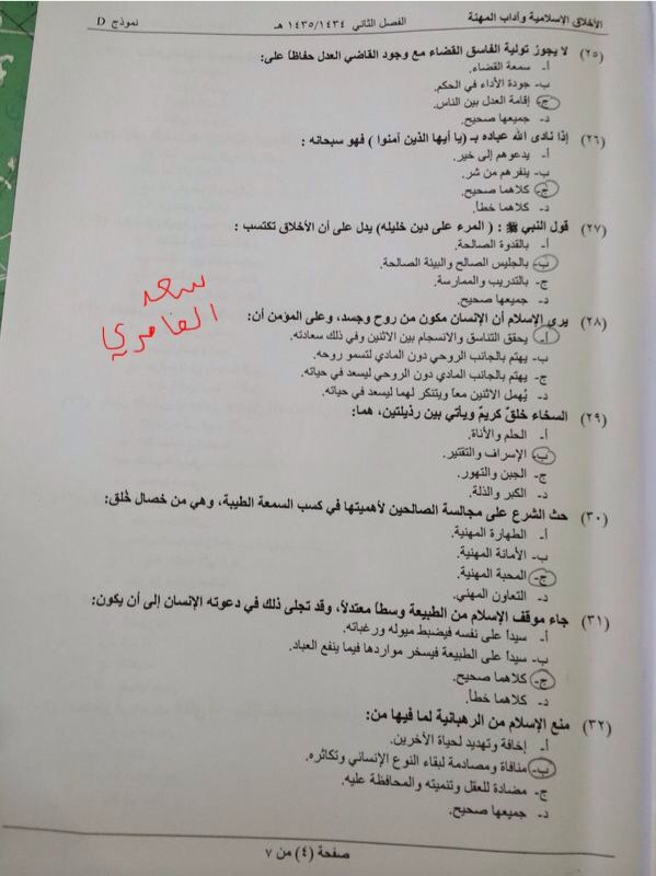 اسئلة مادة الأخلاق الإسلامية وآداب المهنة الفصل الدراسي الثاني 1435هـ نموذج (d)