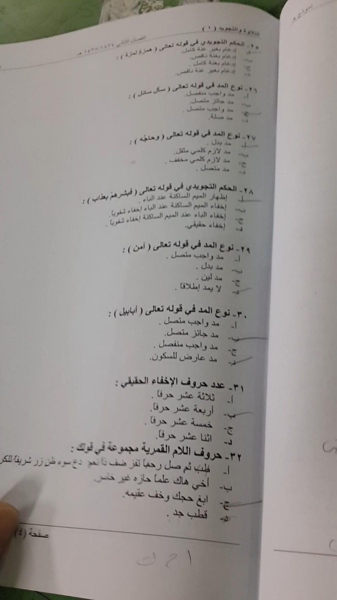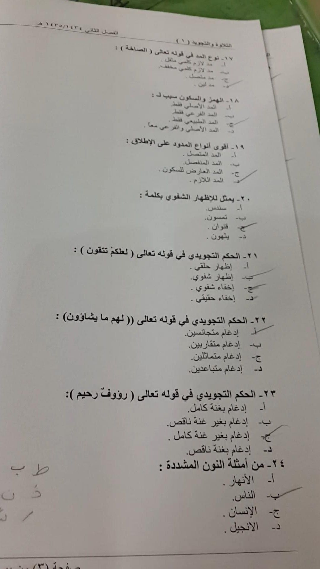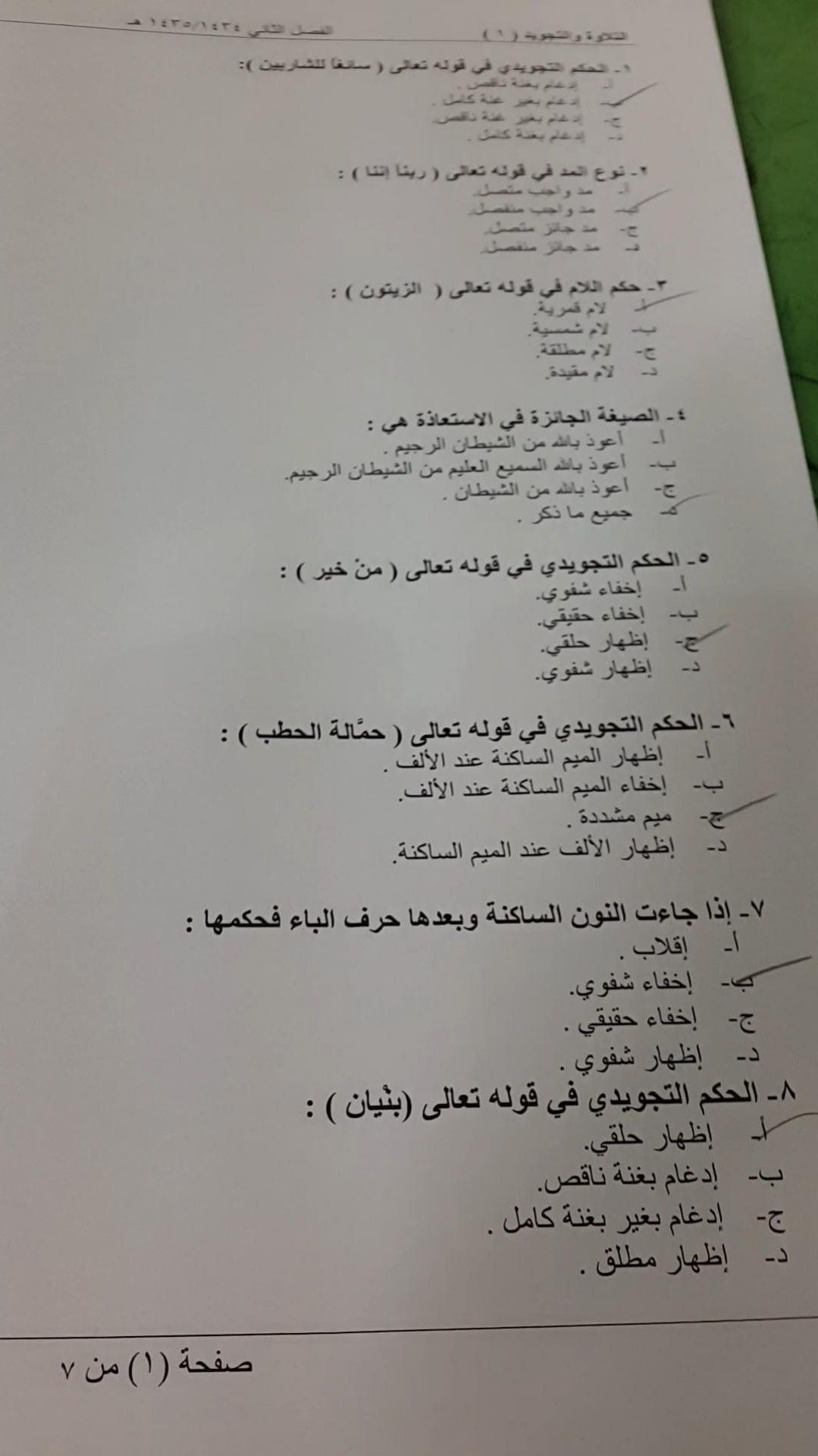 اسئلة اختبار مادة التلاوة والتجويد 1 الفصل الدراسي الثاني 1435هـ