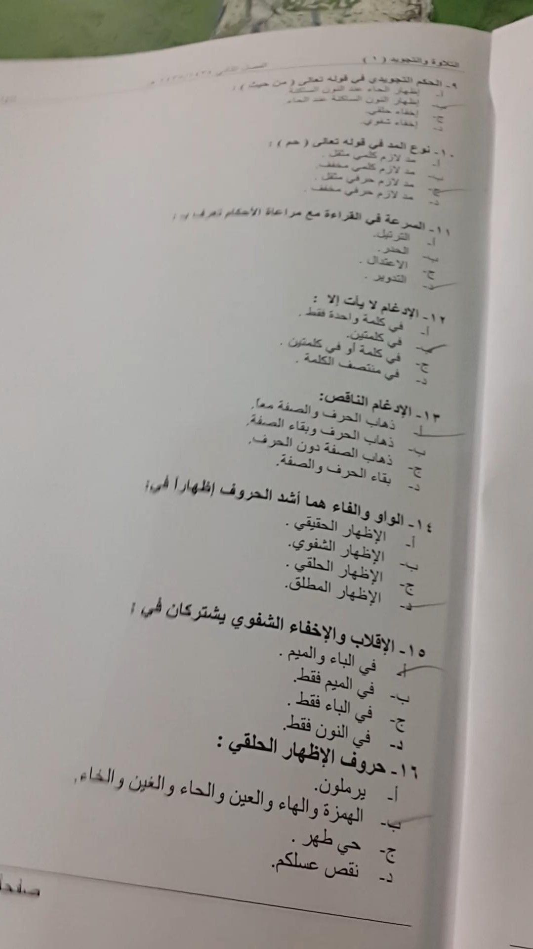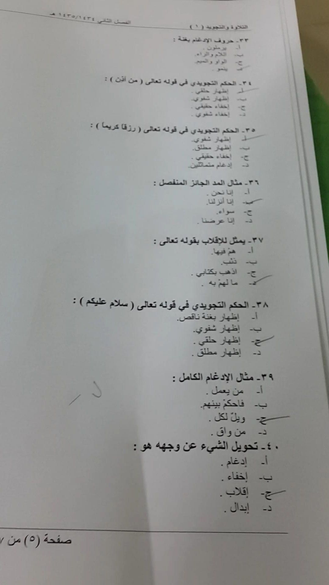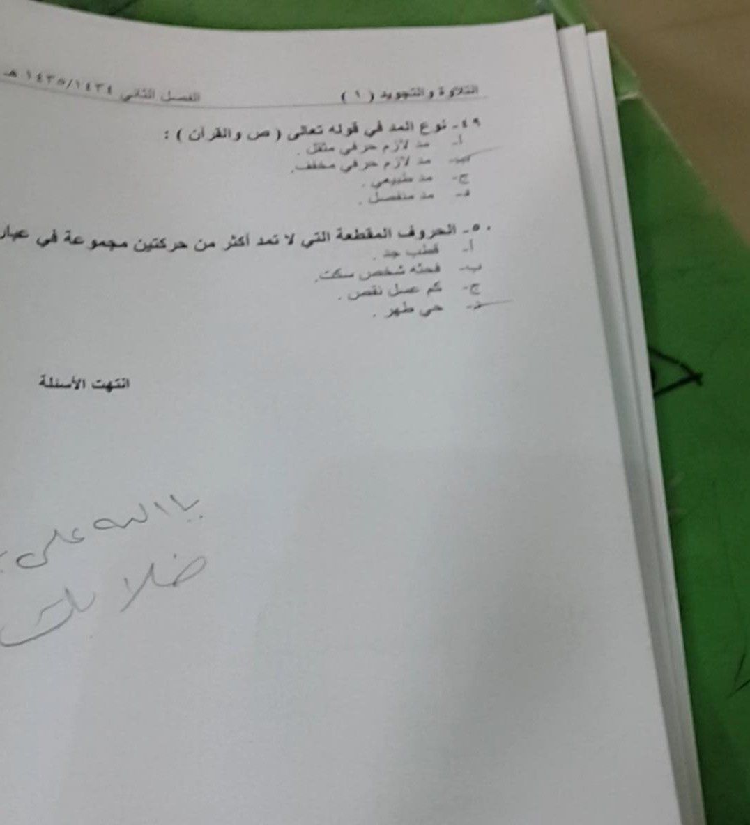اسئلة اختبار مادة التلاوة والتجويد 1 الفصل الدراسي الثاني 1435هـ