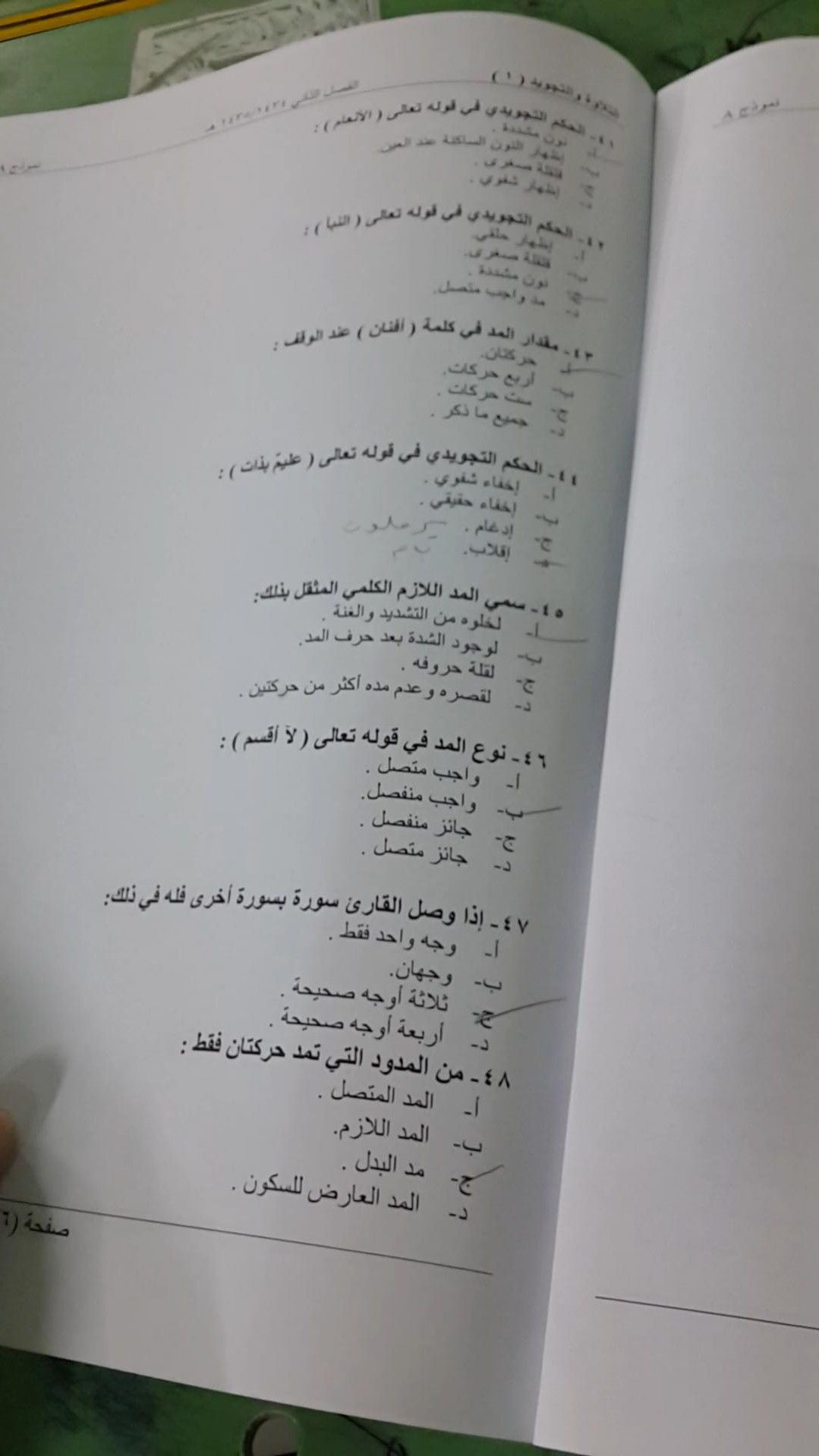 اسئلة اختبار مادة التلاوة والتجويد 1 الفصل الدراسي الثاني 1435هـ نموذج (a)