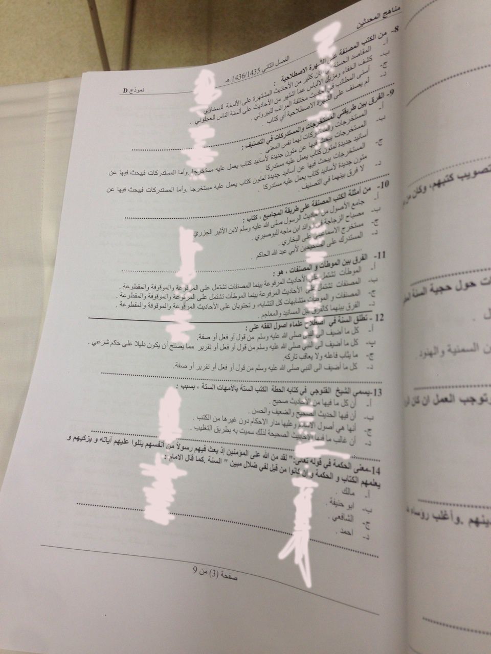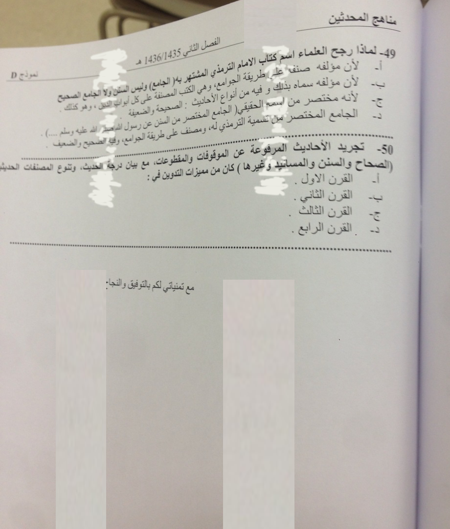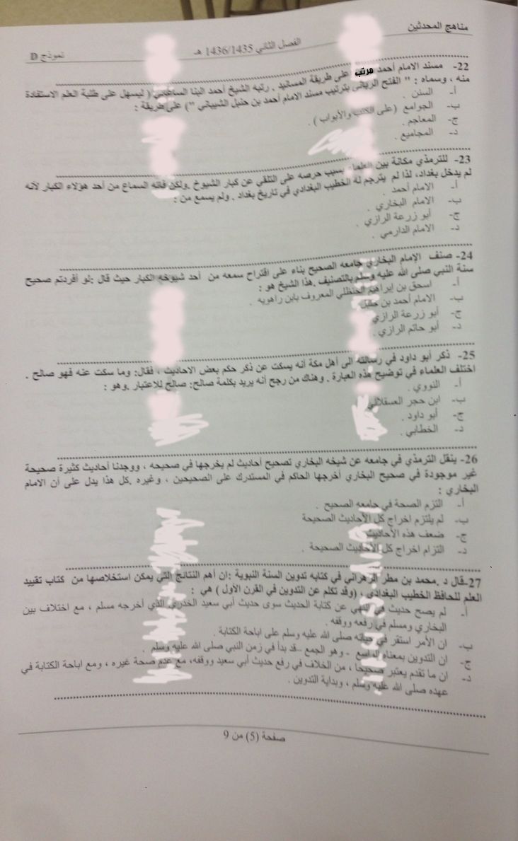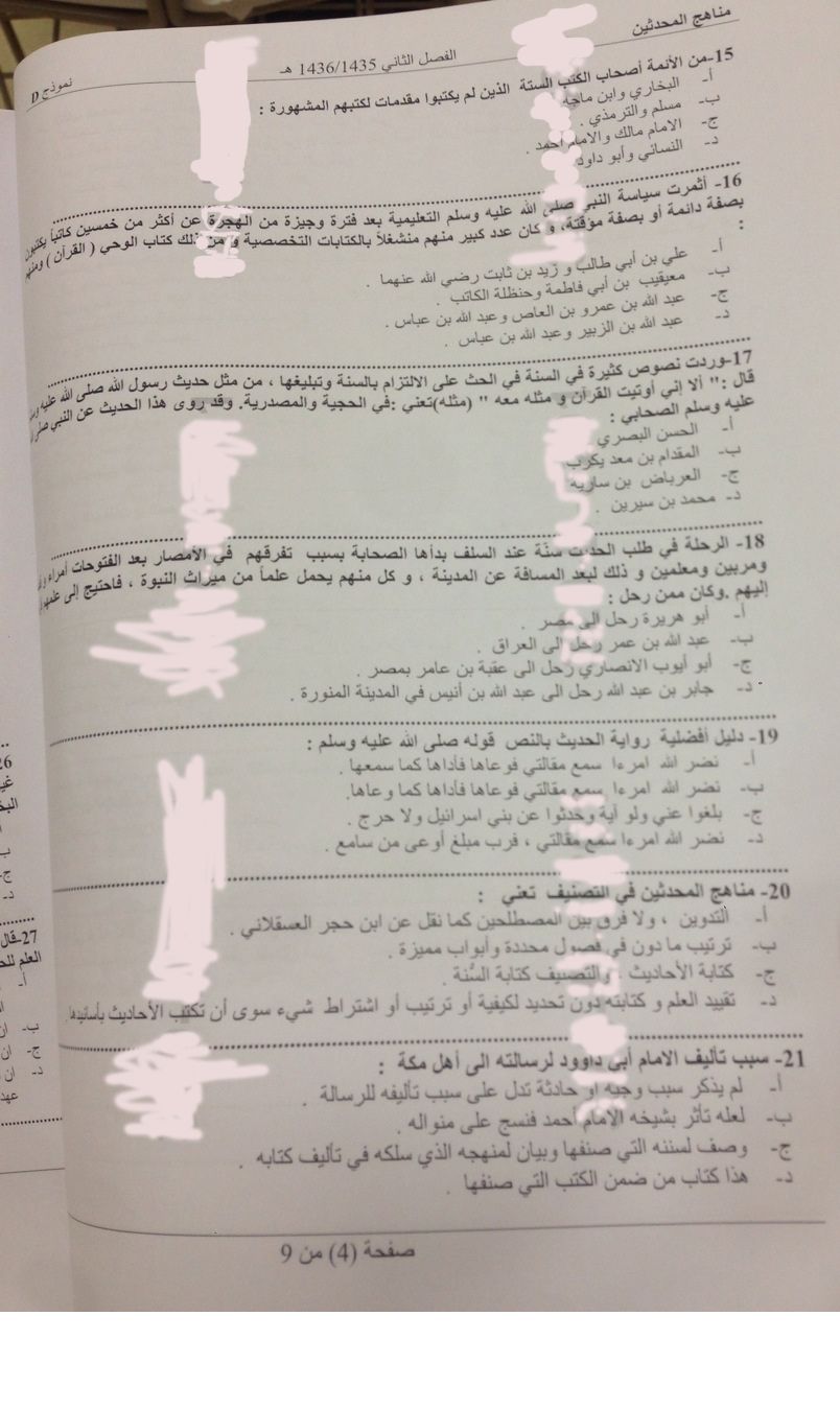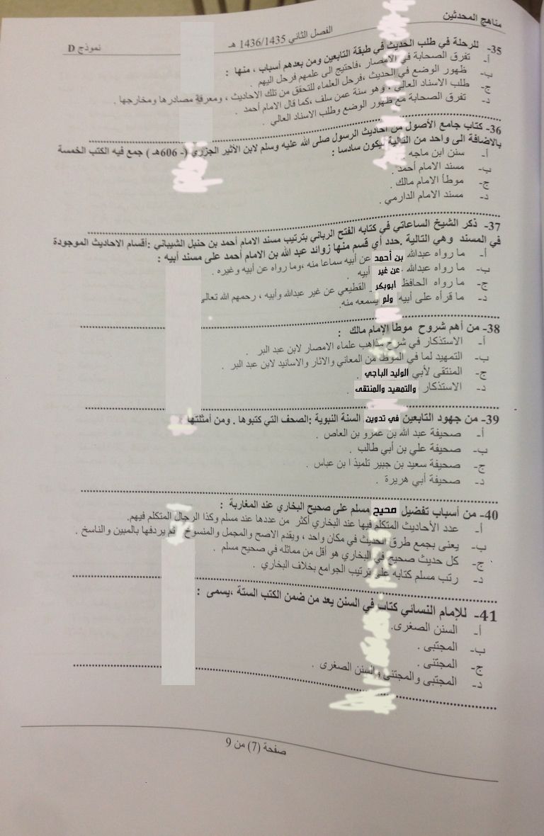 اسئلة اختبار مادة مناهج المحدثين الفصل الثاني 1436هـ نموذج (D)