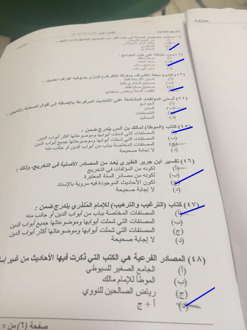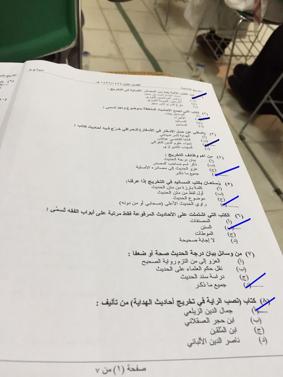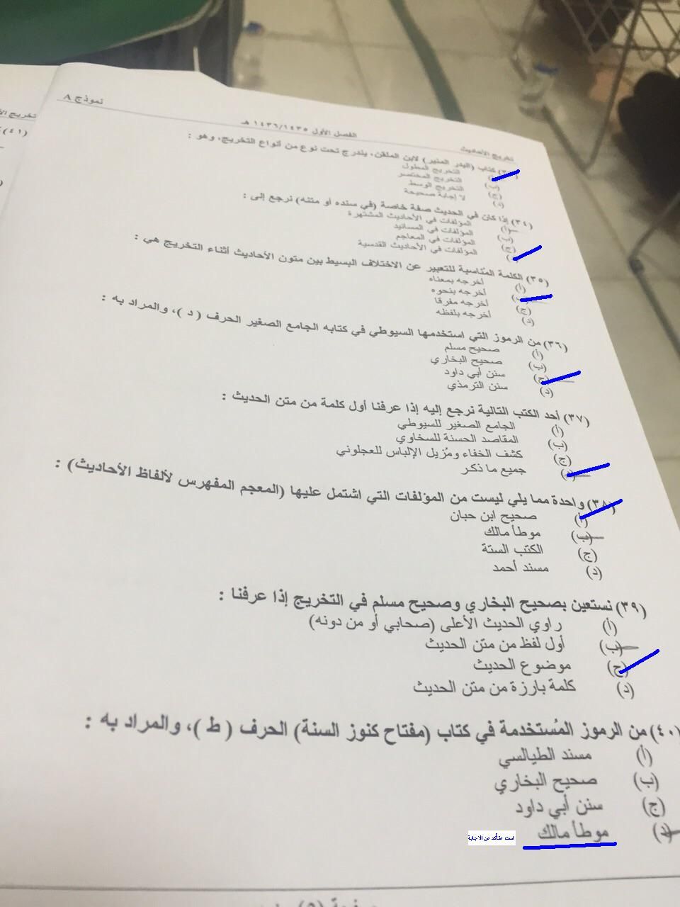 اسئلة اختبار تخريج الأحاديث الفصل الأول 1436هـ نموذج A