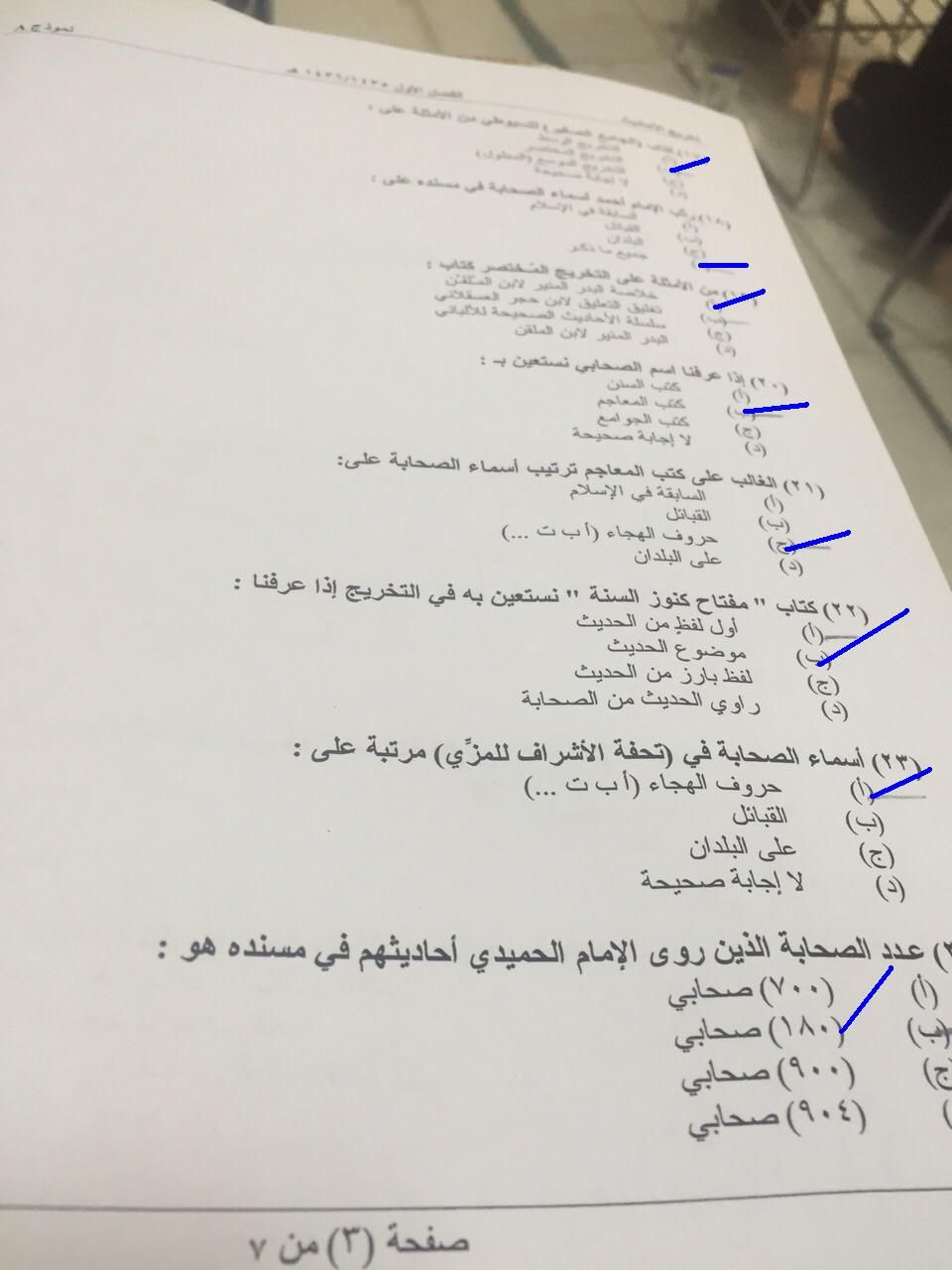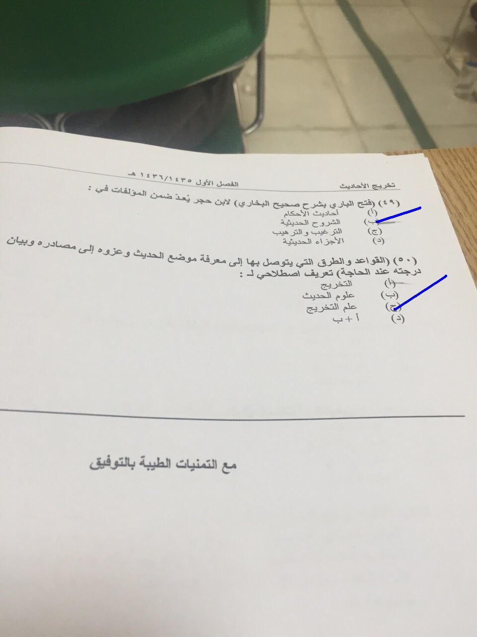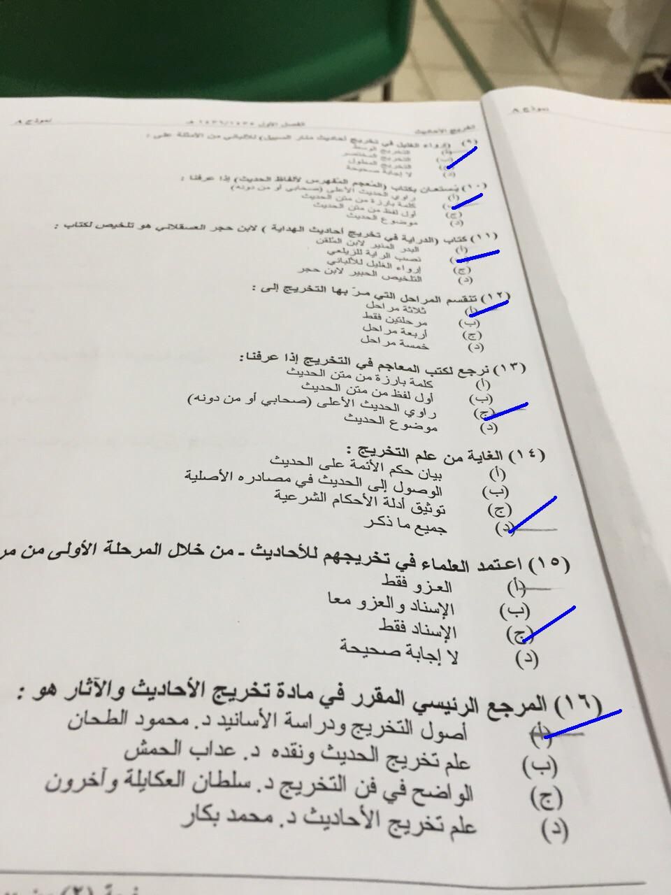 اسئلة اختبار تخريج الأحاديث الفصل الأول 1436هـ نموذج A