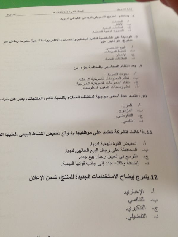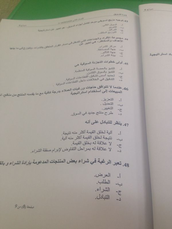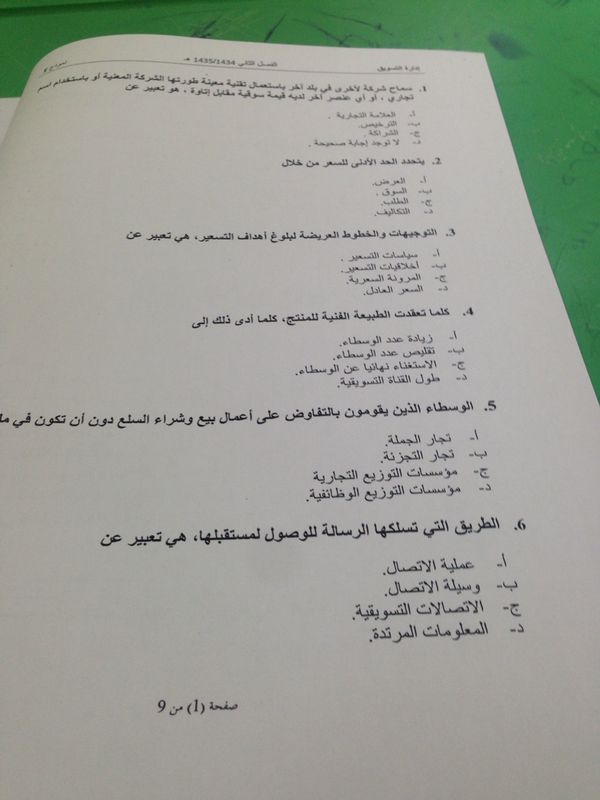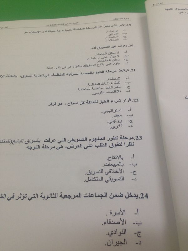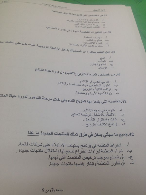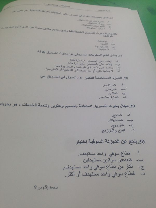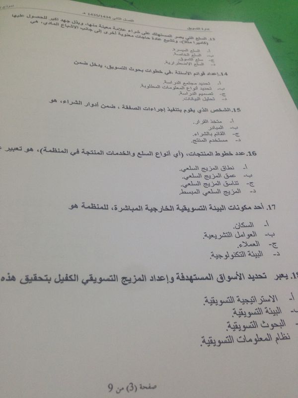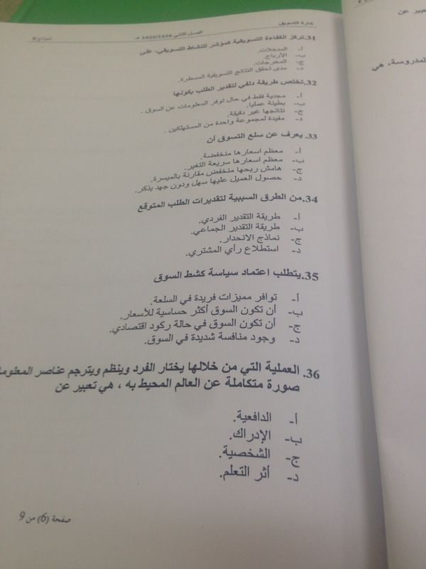 اسئلة اختبار مادة إدارة التسويق الفصل الدراسي الثاني 1435هـ نموذج (e)