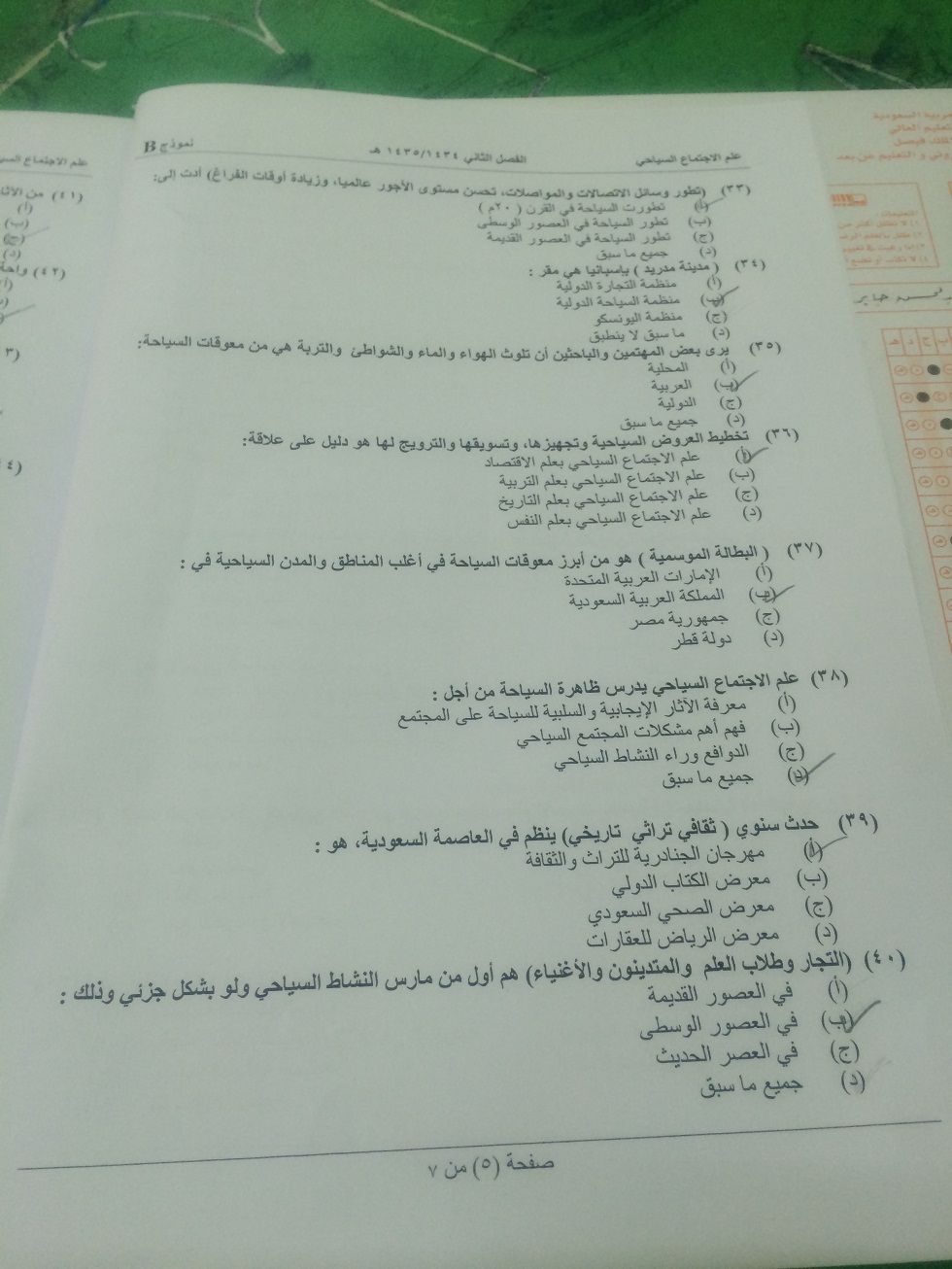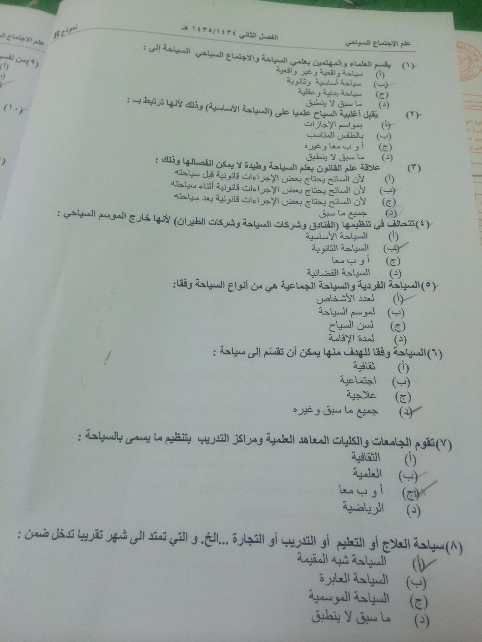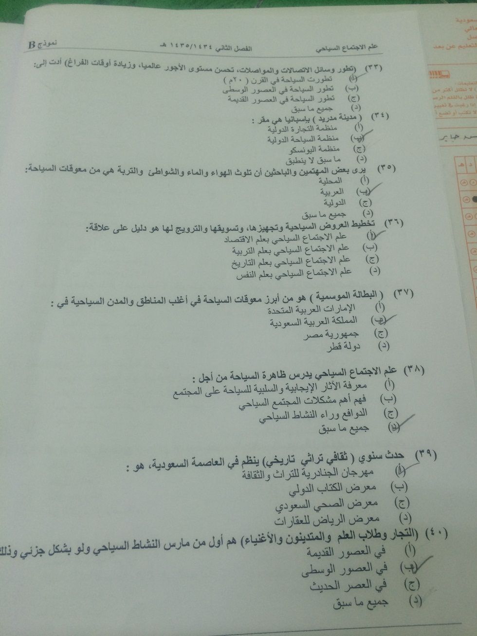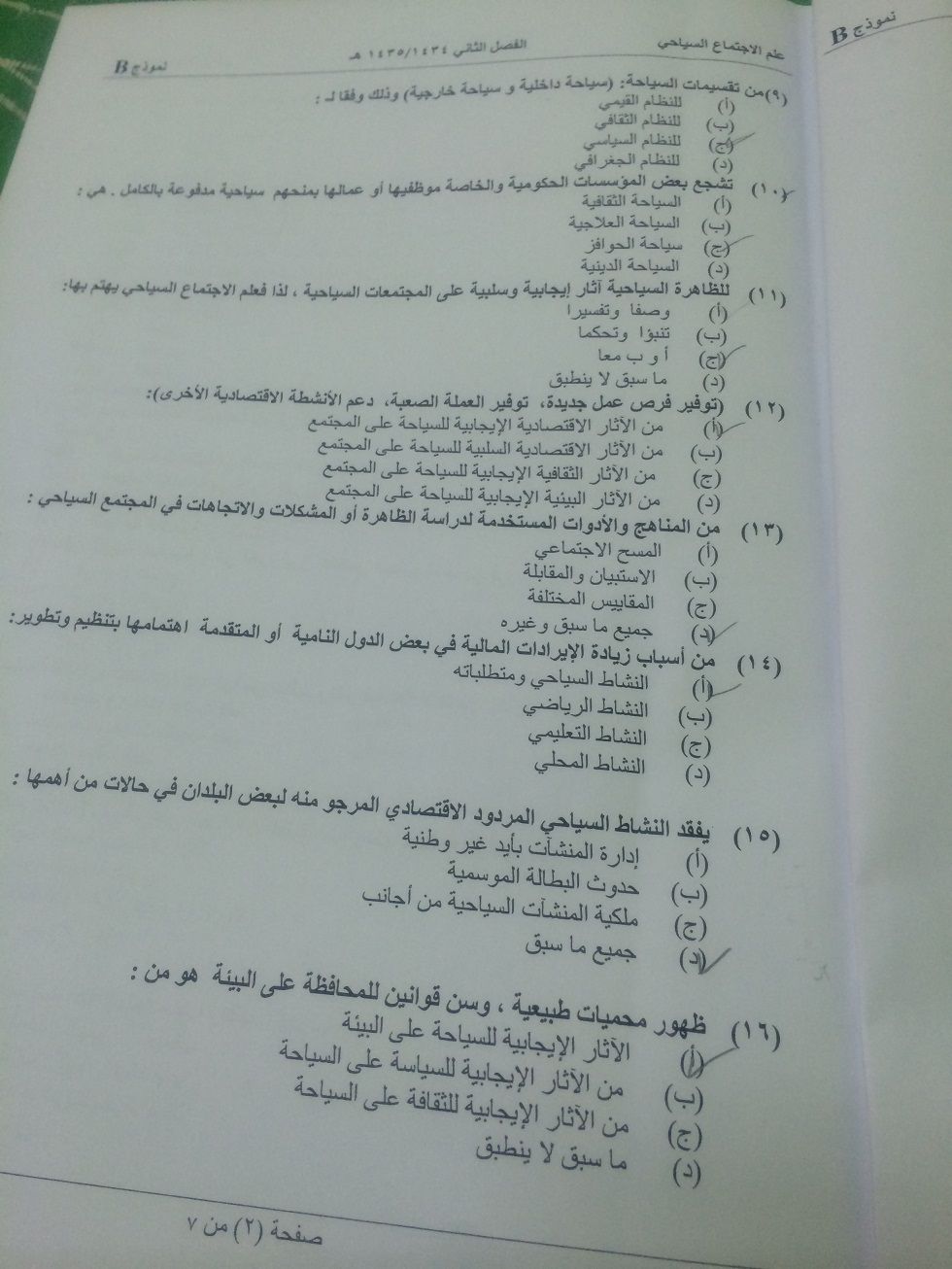 اسئلة مادة علم الاجتماع السياحي الفصل الدراسي الثاني 1435هـ نموذج (b)