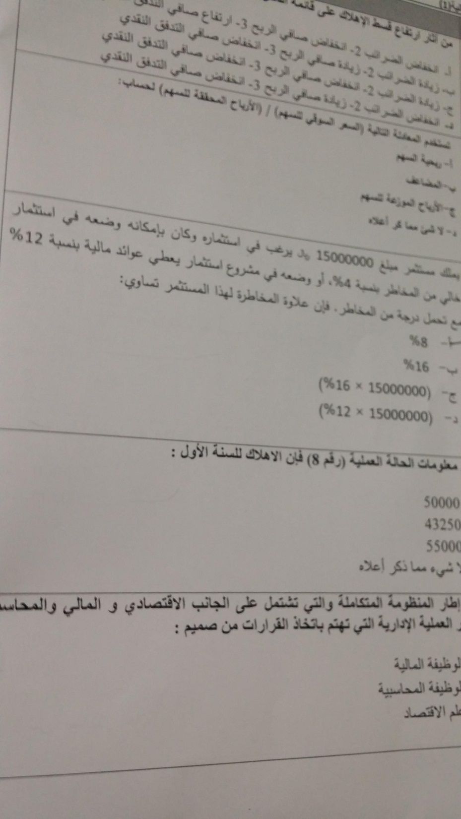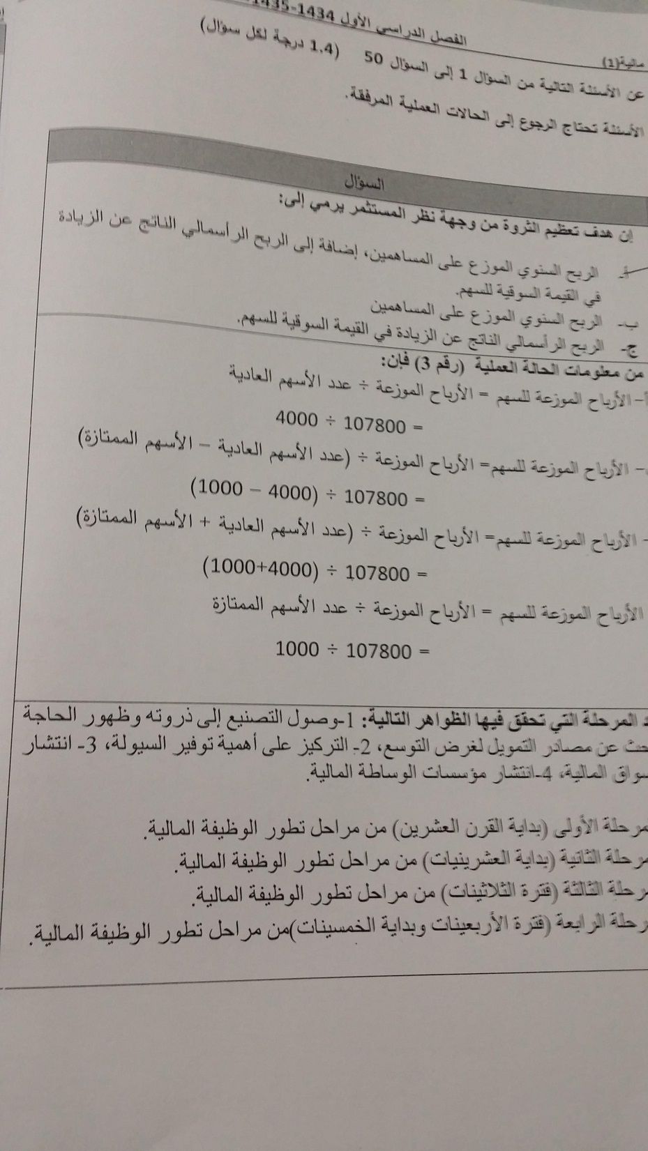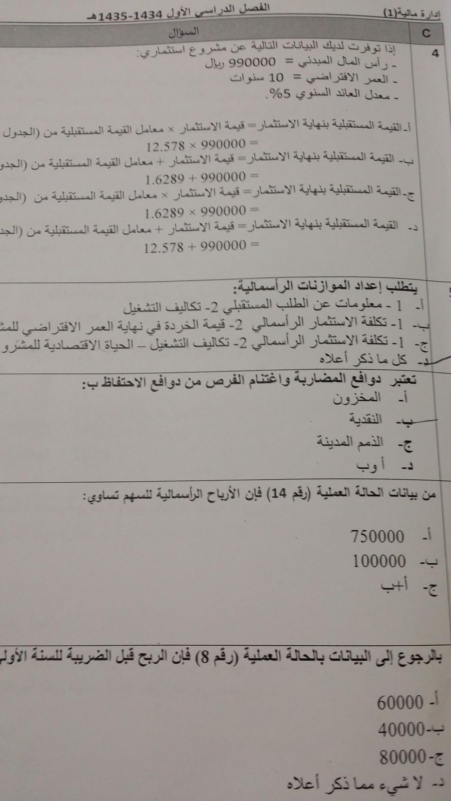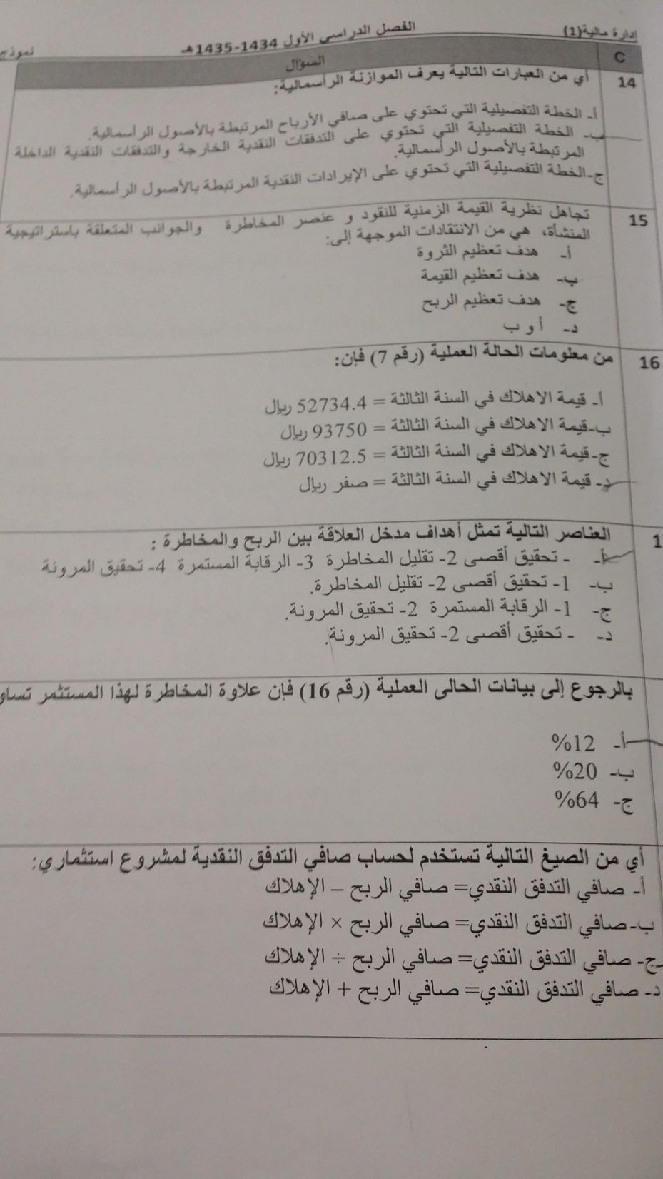 اسئلة اختبار مادة إدارة مالية 1 الفصل الدراسي الأول 1435هـ نموذج (c)